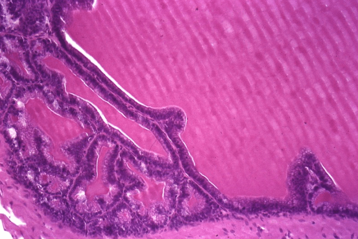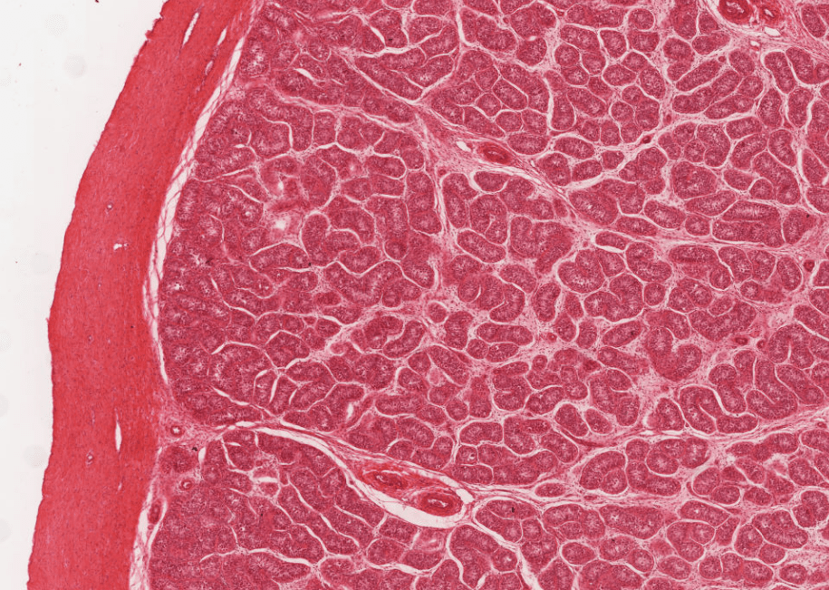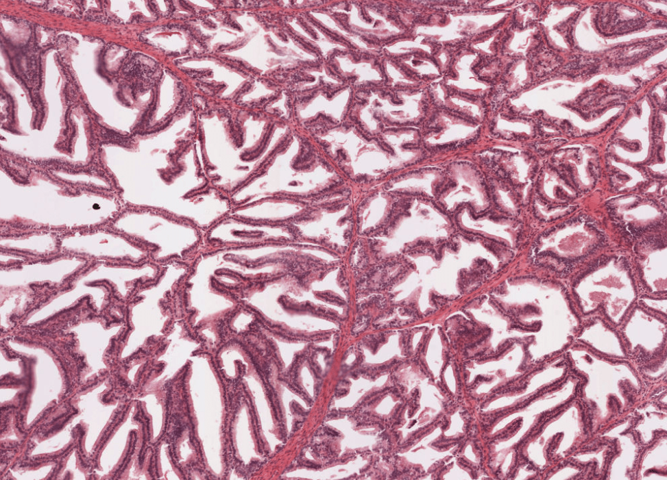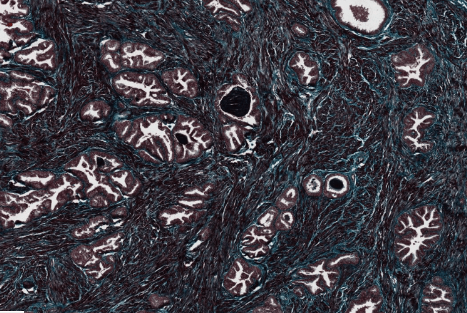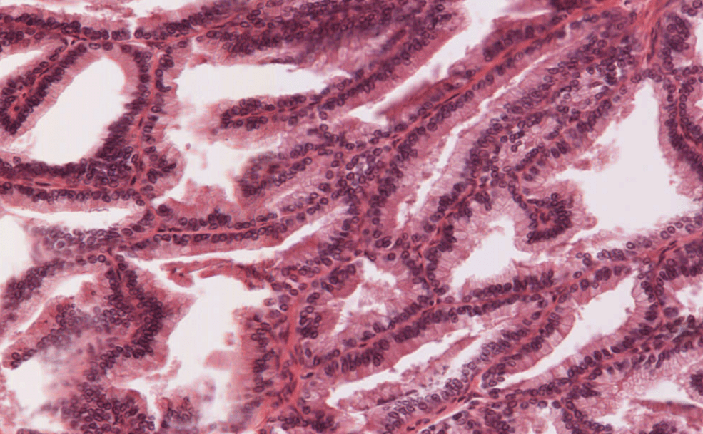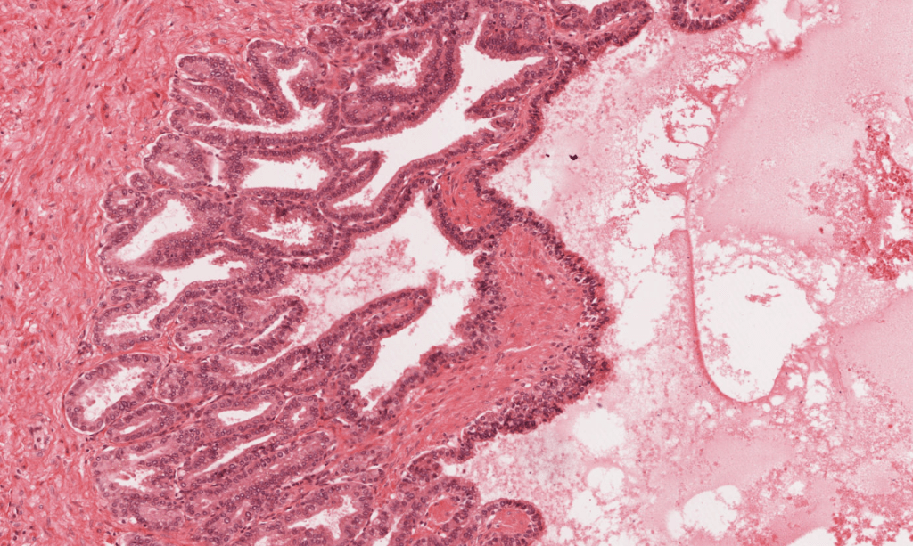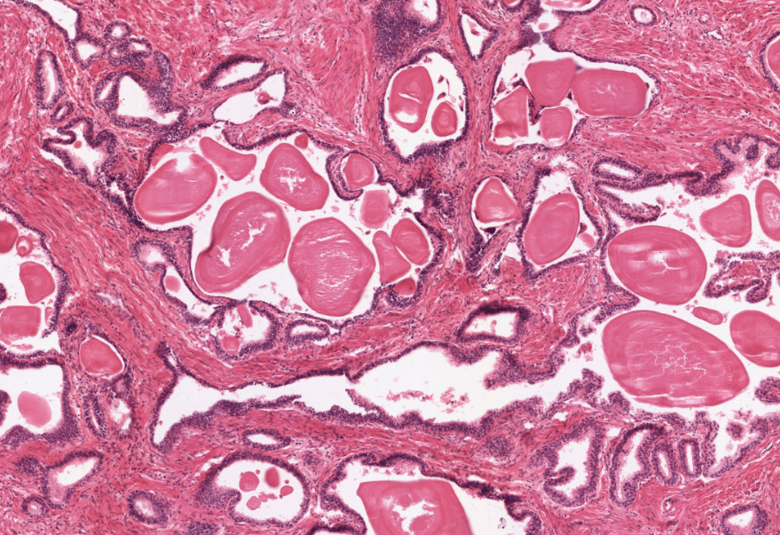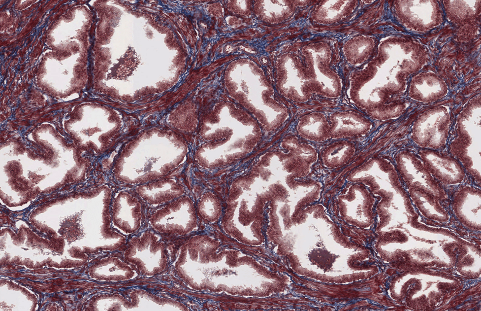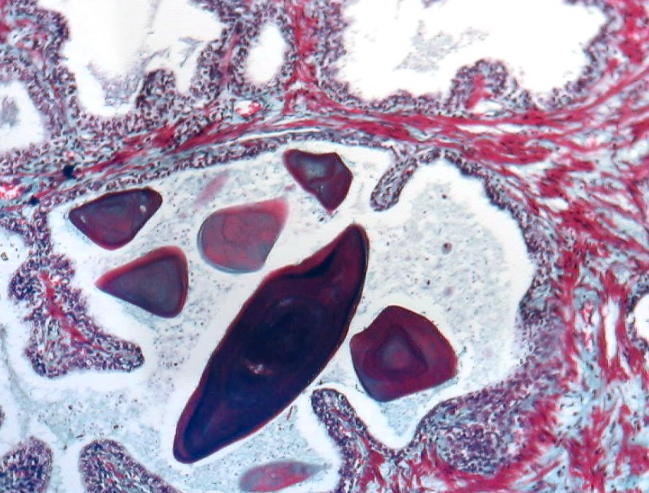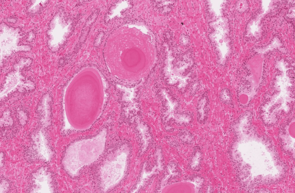 La próstata es un conjunto de entre 30 y 50 glándulas tubuloalveolares ramificadas y envuelven una porción de la uretra denominada uretra prostática