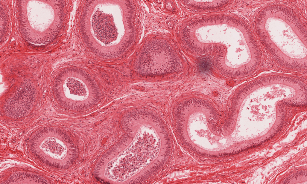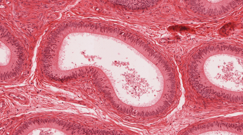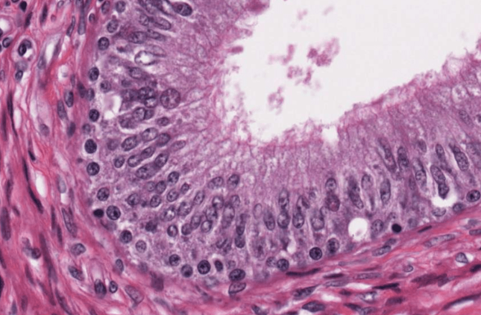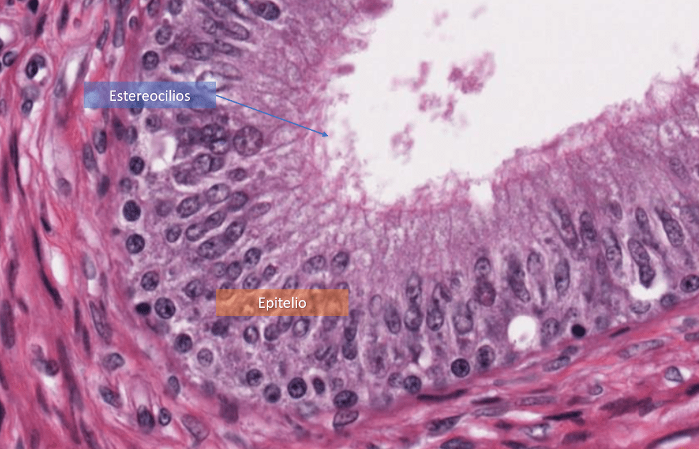 Revestido de un epitelio cilíndrico pseudoestratificado con estereocilios.