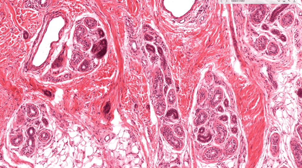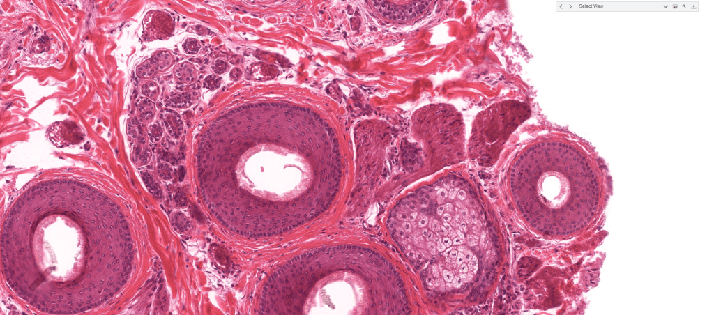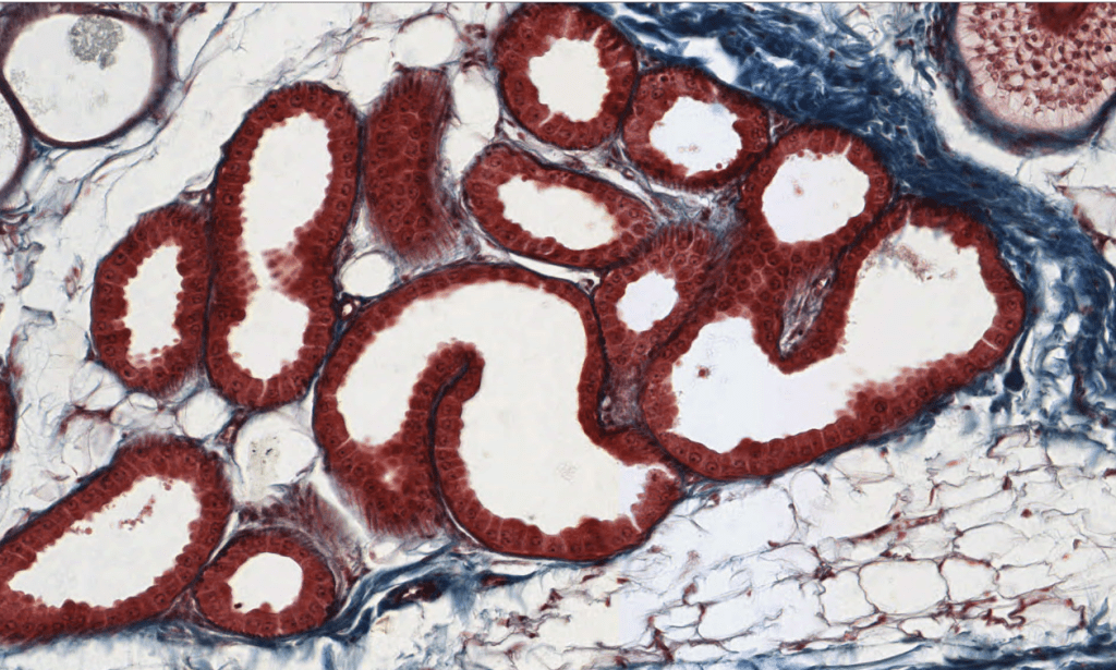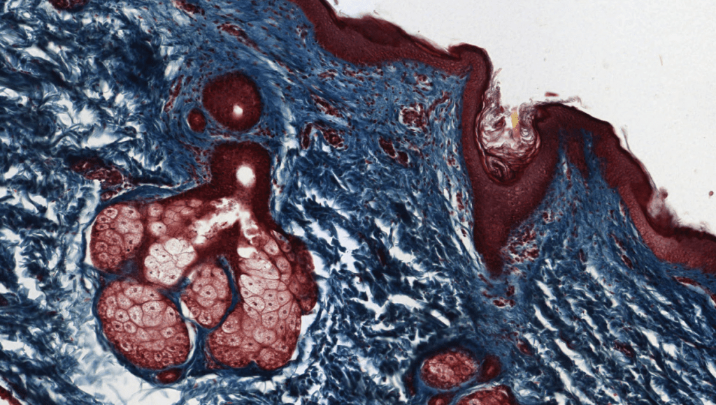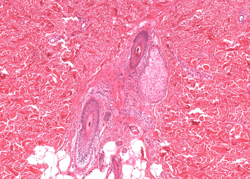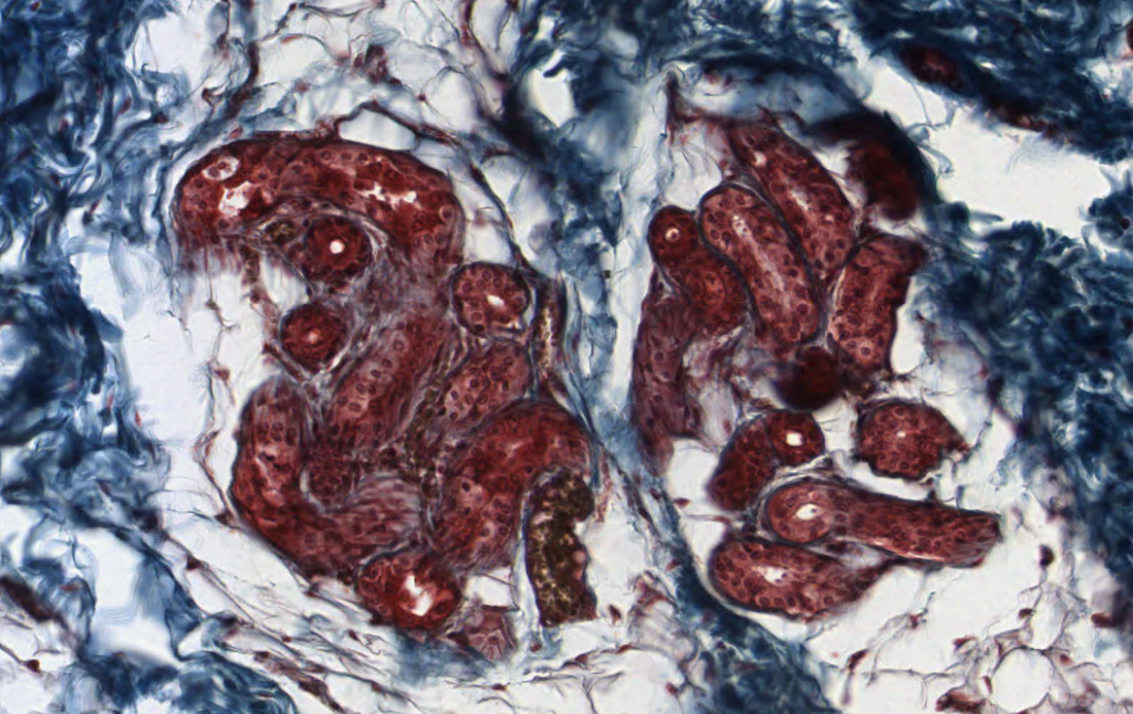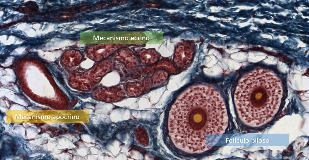 Su secreción principal es sebo y este desaperec durante la técnica histológica, por eso se ve «pálido» con HyE.