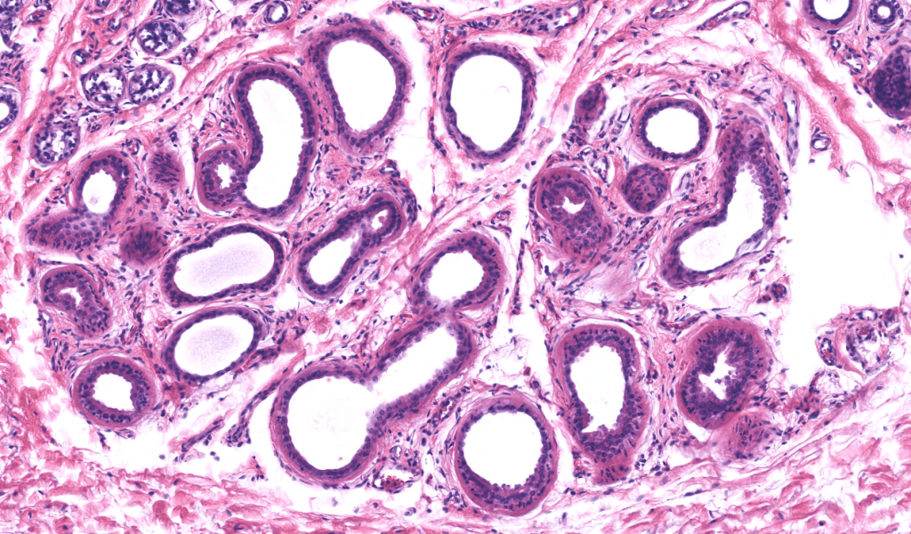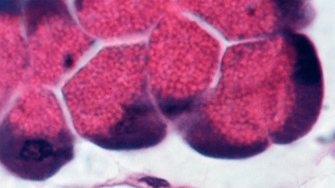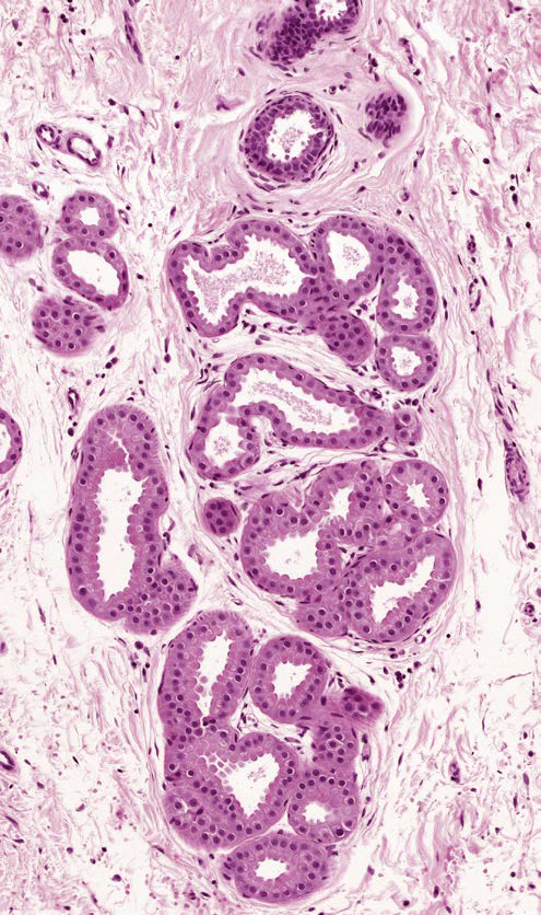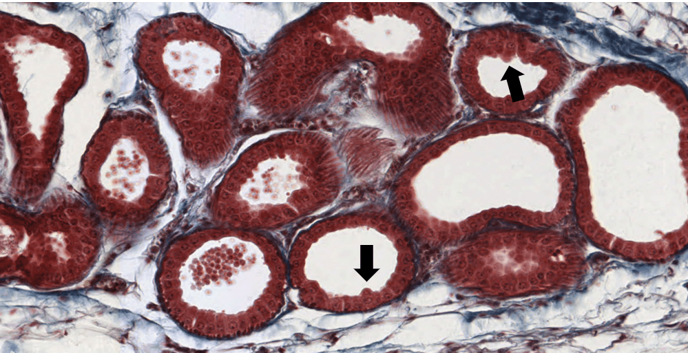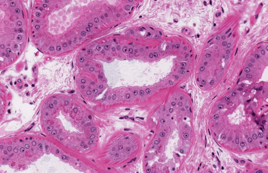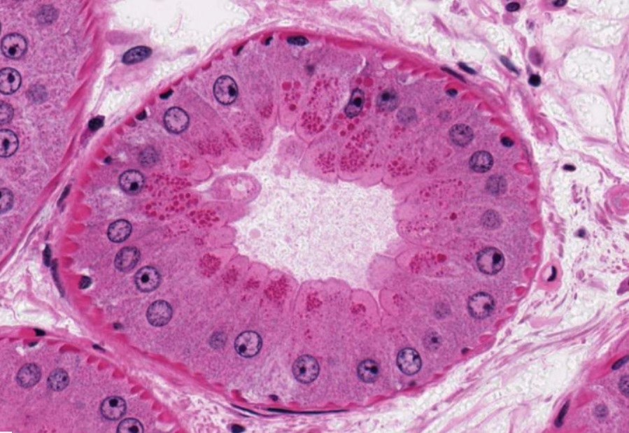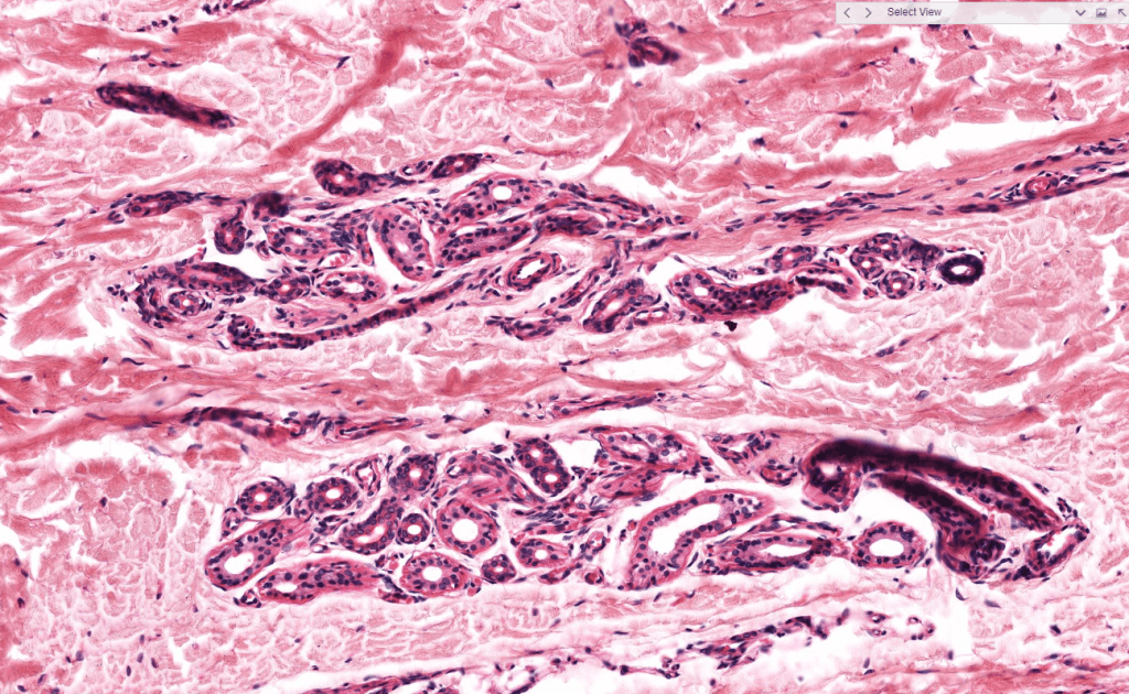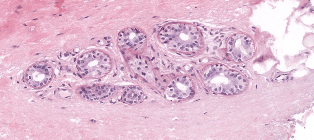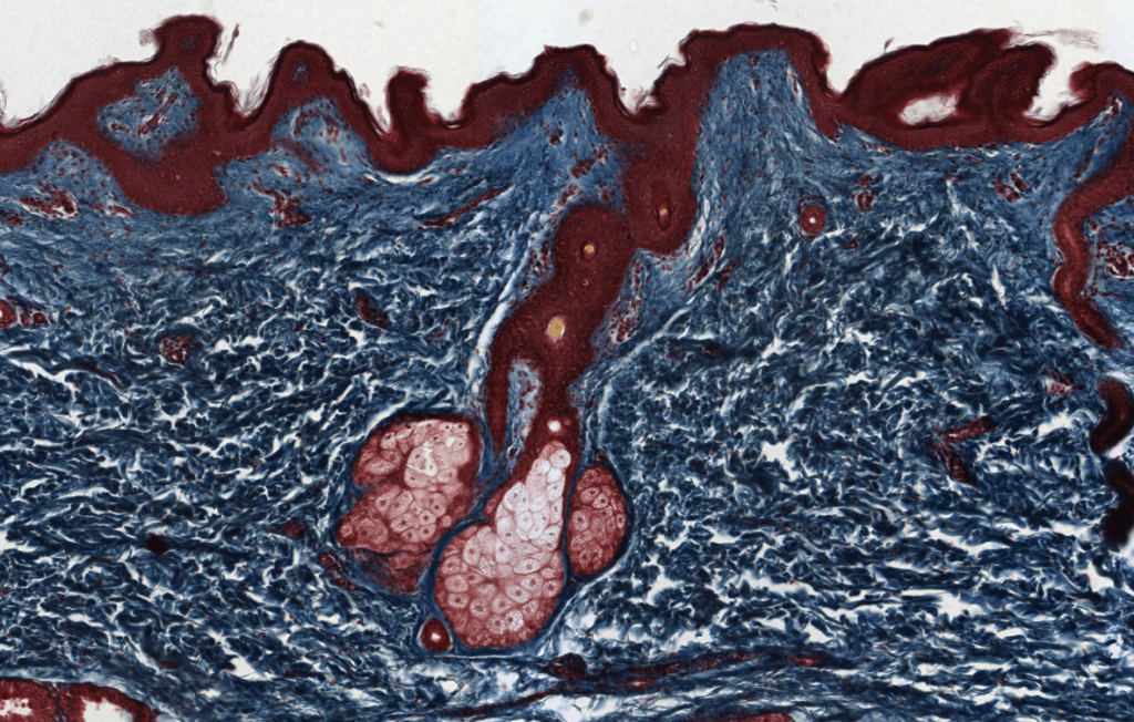 Su secreción principal es sebo y este desaperec durante la técnica histológica, por eso se ve «pálido» con HyE.