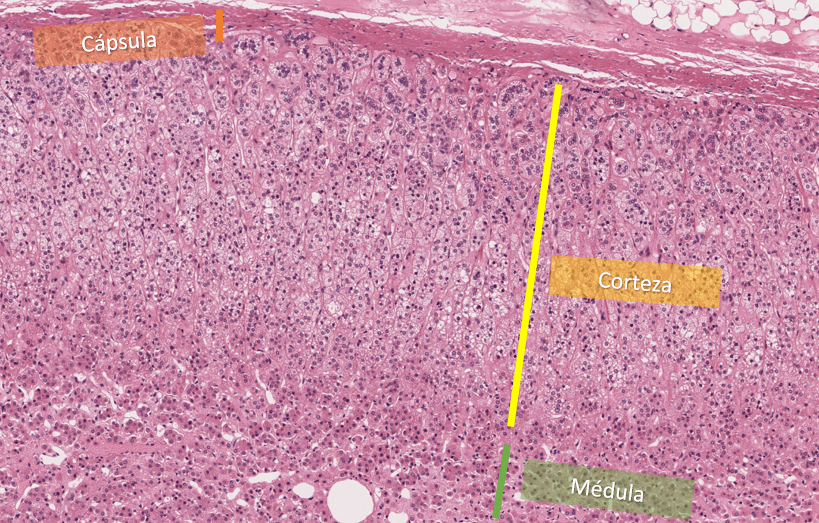 Su corteza se divide en tres capas: glomerular, fascicular, y reticular.