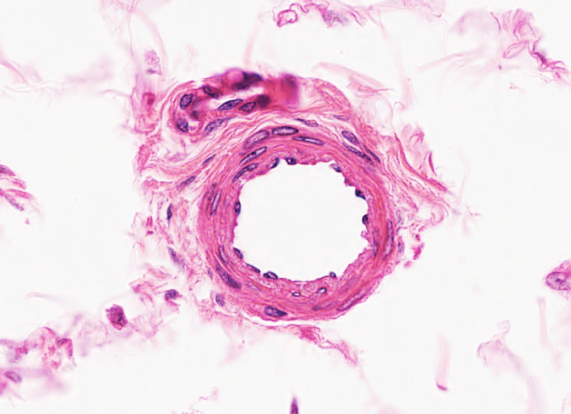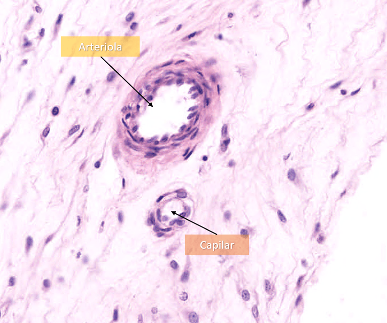 Las arteriolas son las partes terminales de las arterias.Las arteriolas se conforman de 1-3 capas de leiomiocitos en la túnica media, los capilares sólo poseen c. endoteliales en la íntima.Arteriola con capas de leiomiocitos alrededor.En esta fotomicrografía se observan dos arteriolas de distinto calibreArteriola con eritrocitos en su luz.En el bazo, las arteriolas centrales están rodeadas de las Vainas Linfáticas con abundantes linfocitos T. Arteriola rodeada de leiomiocitos, tinción Verhoeff.Recuerde que las arteriolas se asocian con metaarteriolas para regular el fluijo de los lechos cpilares.