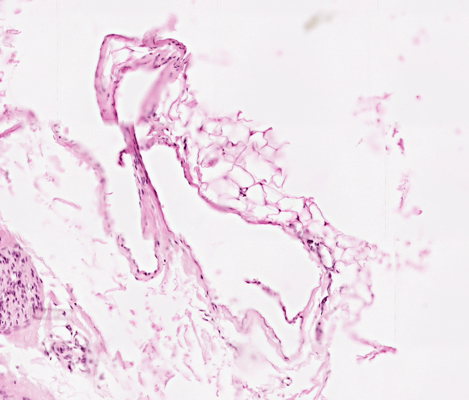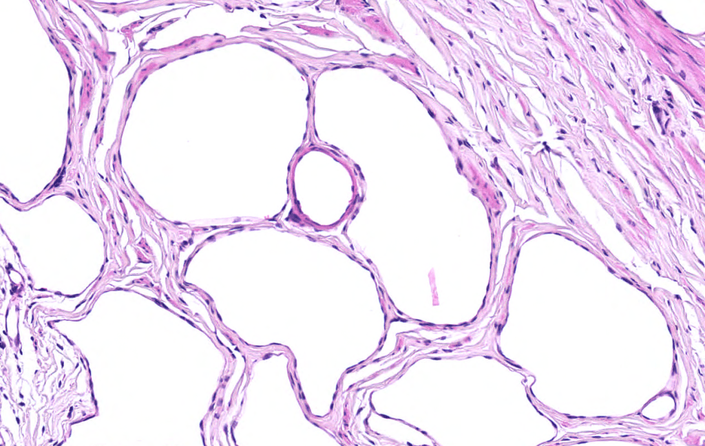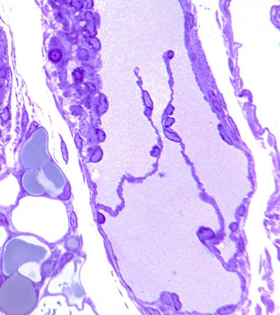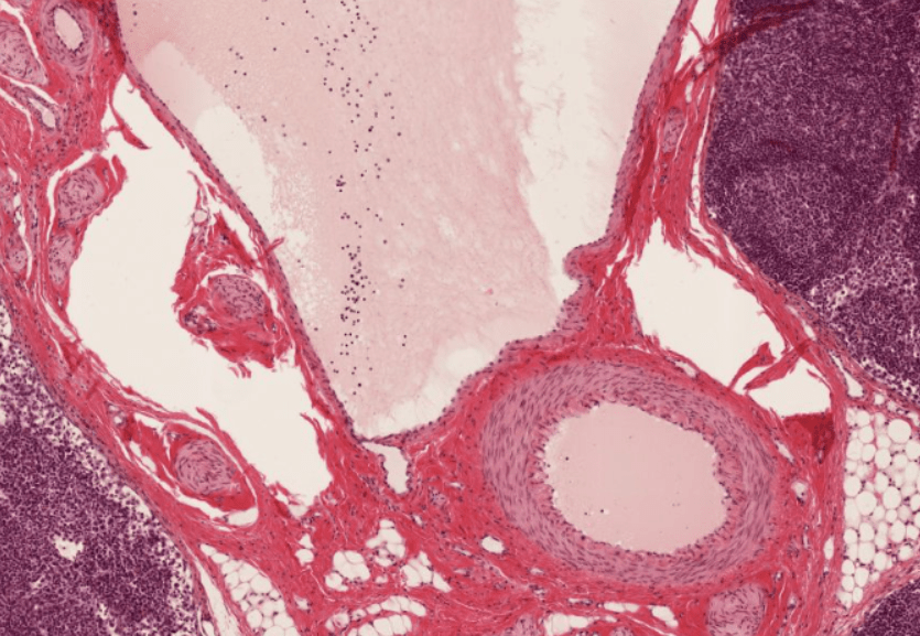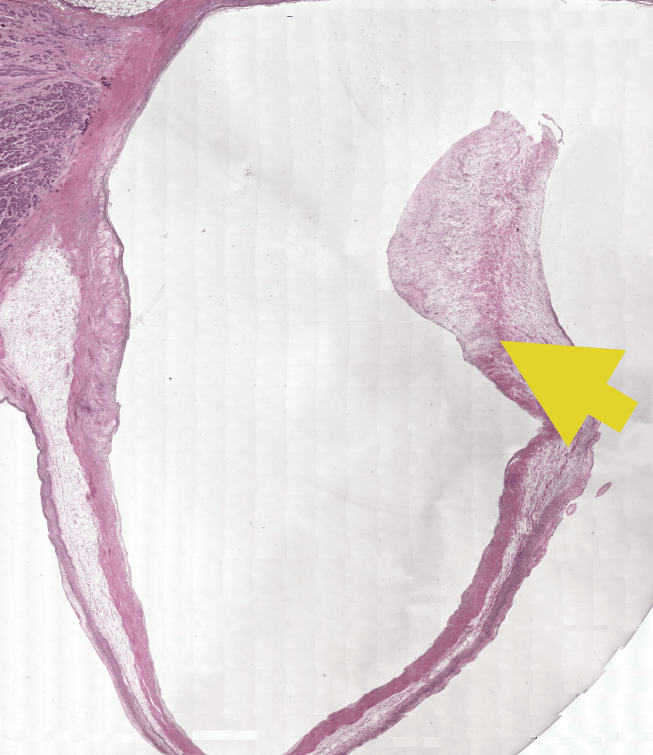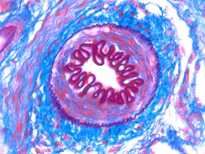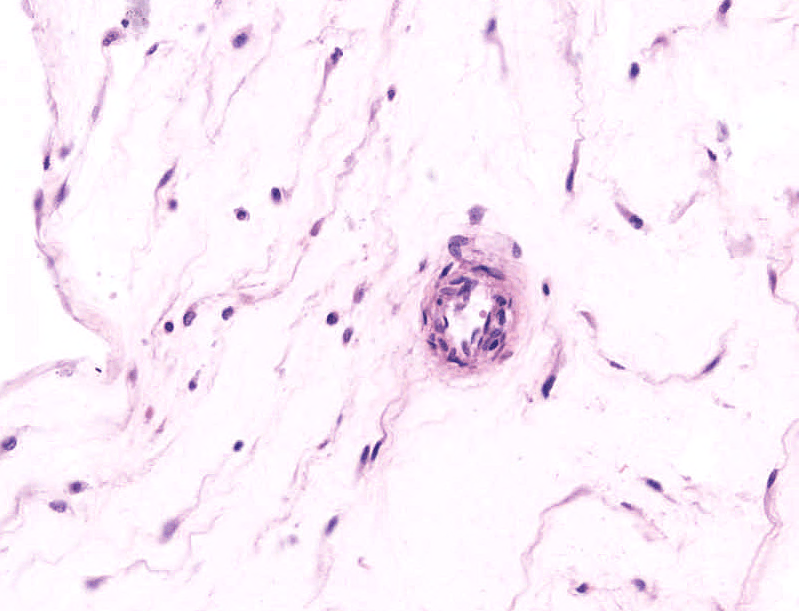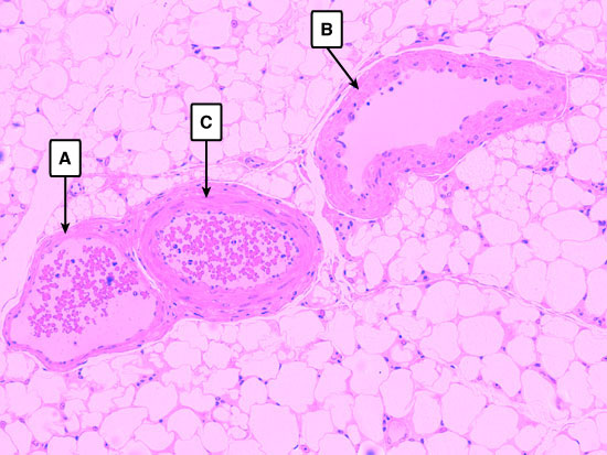 El elemento vascular ubicado en el centro de la imagen es una vena, observe su luz irregular.Arteria en la parte superior y vena en la parte inferior.Las válvulas venosas ubicadas en la túnica íntima de las venas regulan el flujo y evitan el reflujo.Vena cava teñida con tricrómico de Masson.Identifique las luces irregulares exhibidas en las venas.A y B: Venas C: ArteriaIdentifique la luz y el grosor de las paredes de cada vaso.Vena pequeña que exhibe una valva que sale de su túnica íntima.