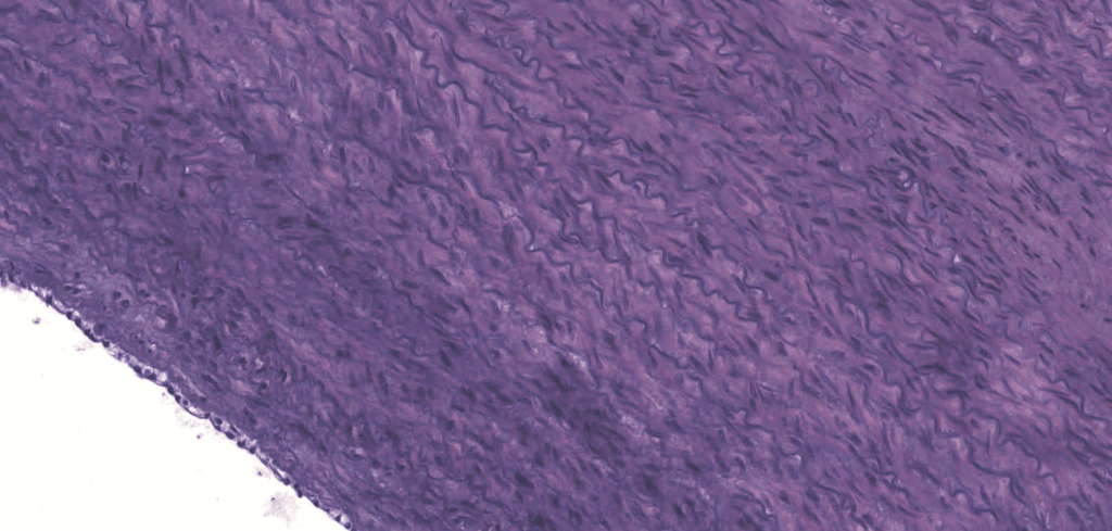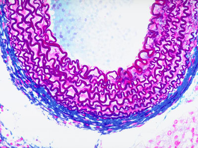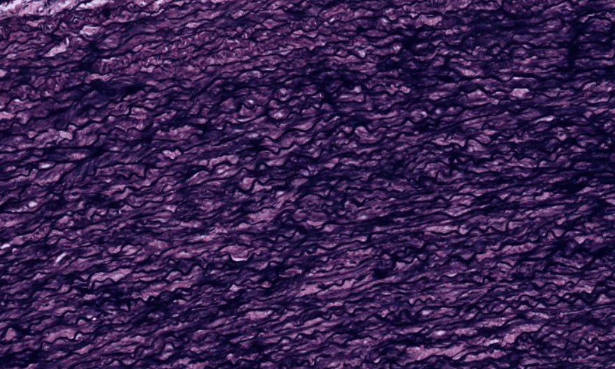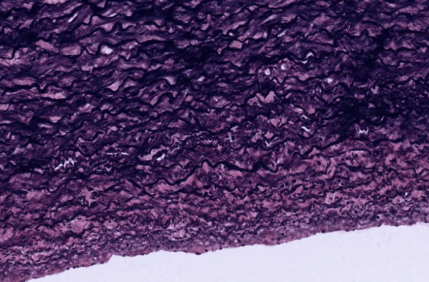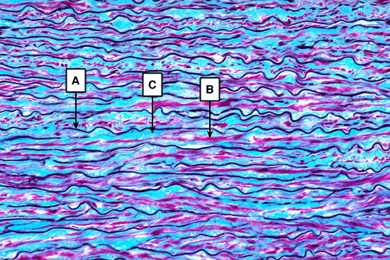A. Fibra elástica B. Fibra de colágena C. LeiomicitoObserve la disposición fenestrada de las fibras elásticas en las arterias elásticas.La túnica media de las arterias de conducción se compone principalmente de fibras elásticas.Las arterias elásticas más conocidas del cuerpo humano son la AORTA y las ARTERIAS PULMONARES.Observe la túnica íntima en la parte inferior izq. de la imagen.Las arterias elásticas se encargan de recibir las sangre que proviene de corazón a gran presión.