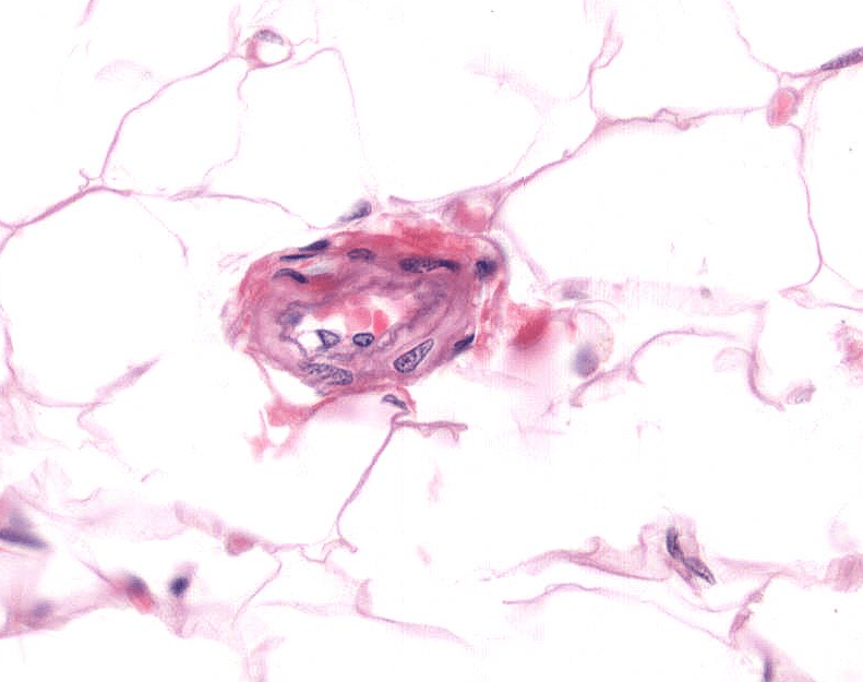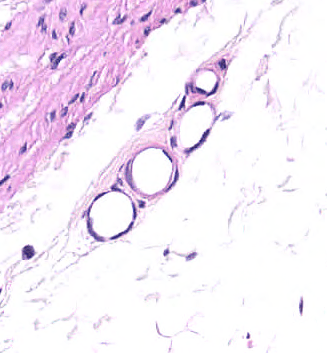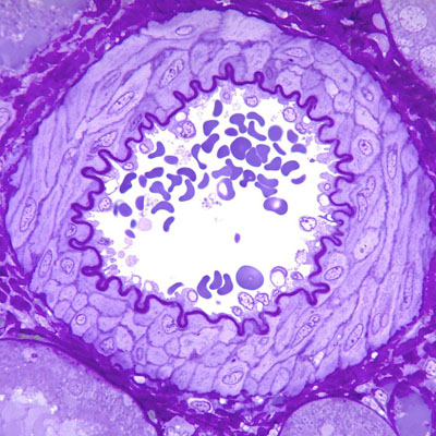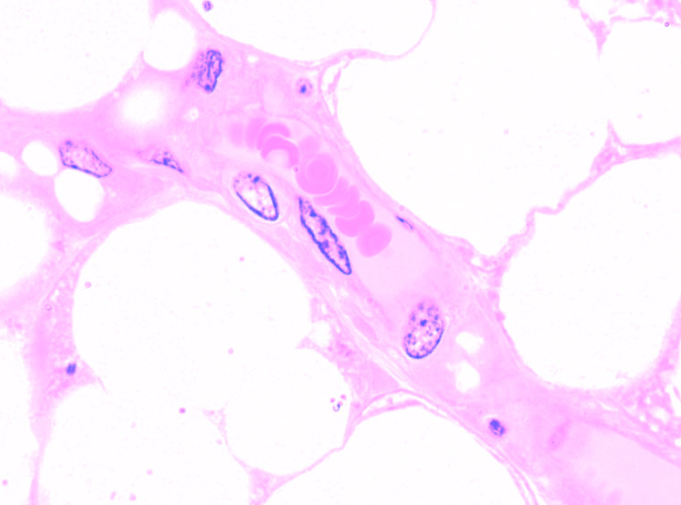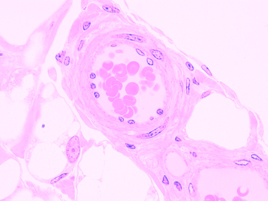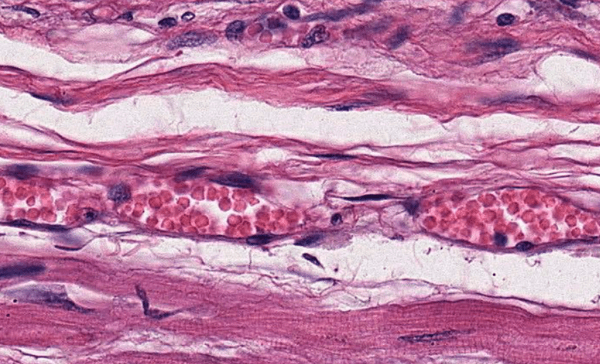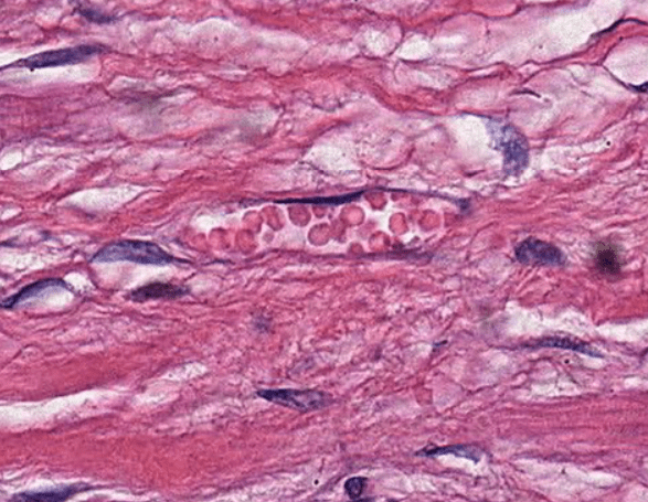 Los capilares continuos son los más abundantes del cuerpo humano.Identifique el capilar en corte longitudinal con eritrocitos en su luz.Aquí observamos un grupo de capilares listos para irse a trabajar!El músculo es un tejido altamente vascularizado, identifique los capilares que discurren entre las fibras musculares.Los capilares tienen el diámetro aproximado de un eritrocito. (8 micras)Glándulas endocrinas como el páncreas se irrigan con capilares fenestrados que permiten el paso de las hormonas.