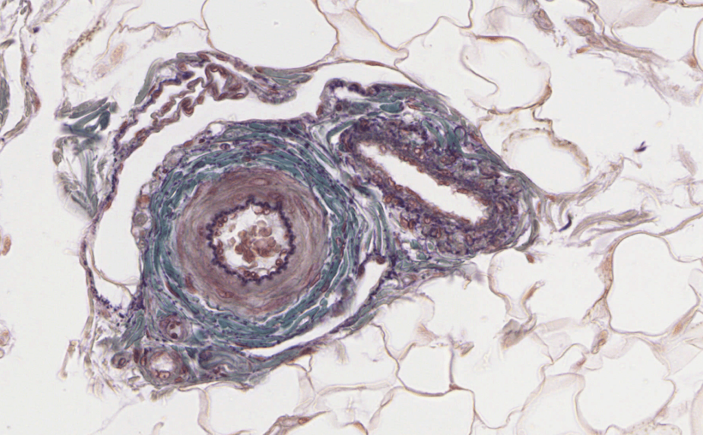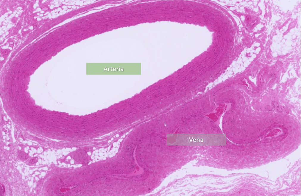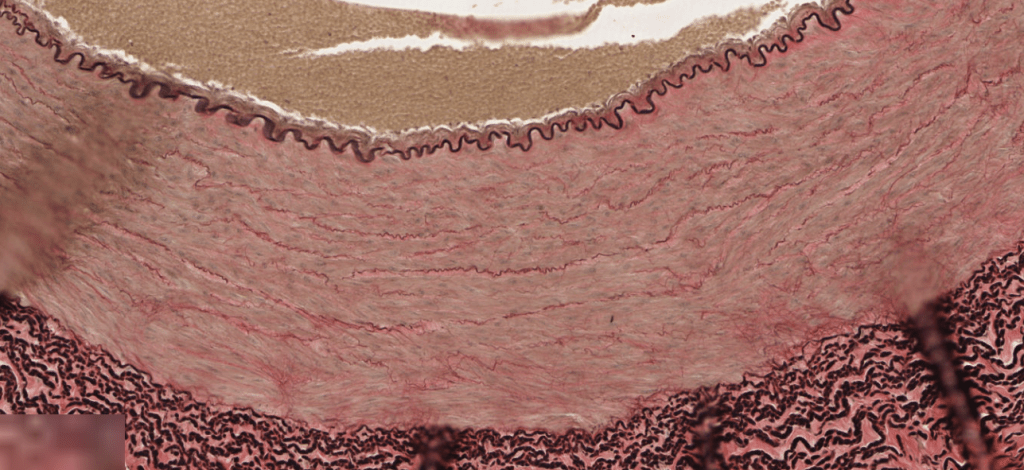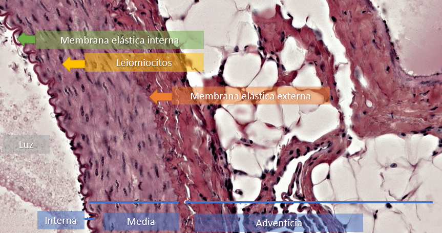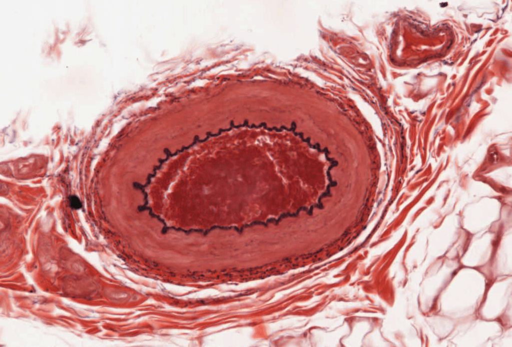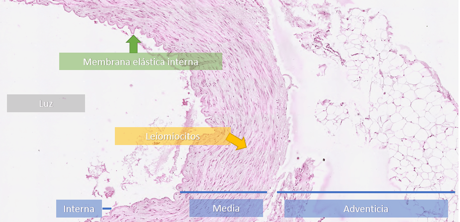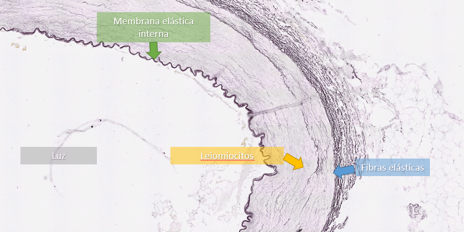 Identifique la lámina elástica interna bien desarrollada en la túnica íntima.Las arterias musculares se caracterizan por tener una lámina elástica interna y externa bien desarrollada en la túnica íntima.La túnica media de estas arterias se caracteriza por poseer abundantes leiomiocitos dispuestos en forma helicoidal.La túnica media de estas arterias les permite distribuir la sangre a los tejidos corporales.Identifique los elementos señalados:Identifique los elementos señalados:Identifique los elementos señalados:Arterias musculares grandes y pequeñas ubicadas en miometrio.Con la técnica de Verhoeff podemos identificar la lámina única fenestrada que conforma la Lámina Elástica Interna.La Vasa Vasorum se ubica en la túnica adventicia de arterias y venas y se encarga de darla nutrientes a las células ubicadas en la túnica media.Observe la escasa distribución de fibras elásticas en la túnica media de la arteria muscular.Las arterias musculares poseen células musculares lisas dispuestas de forma helicoidal en la túnica media y dispuestas longitudinalmente en la túnica adventicia..Las técnicas como Verhoeff nospermiten identificar fácilmente las fibras elásticas en las arterias.Arteria muscular (derecha) y vena (derecha).