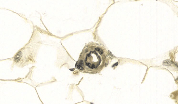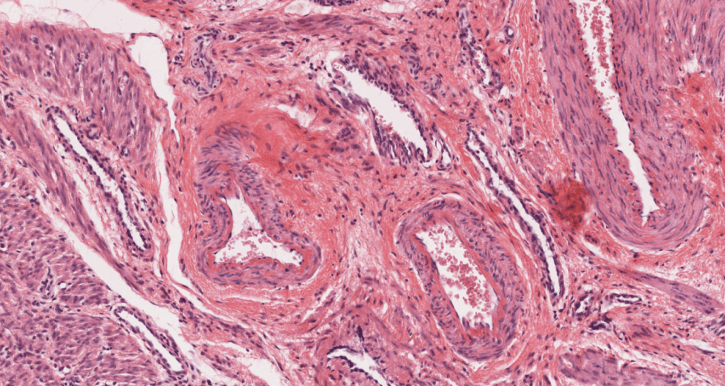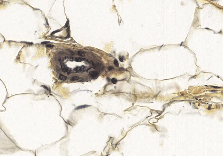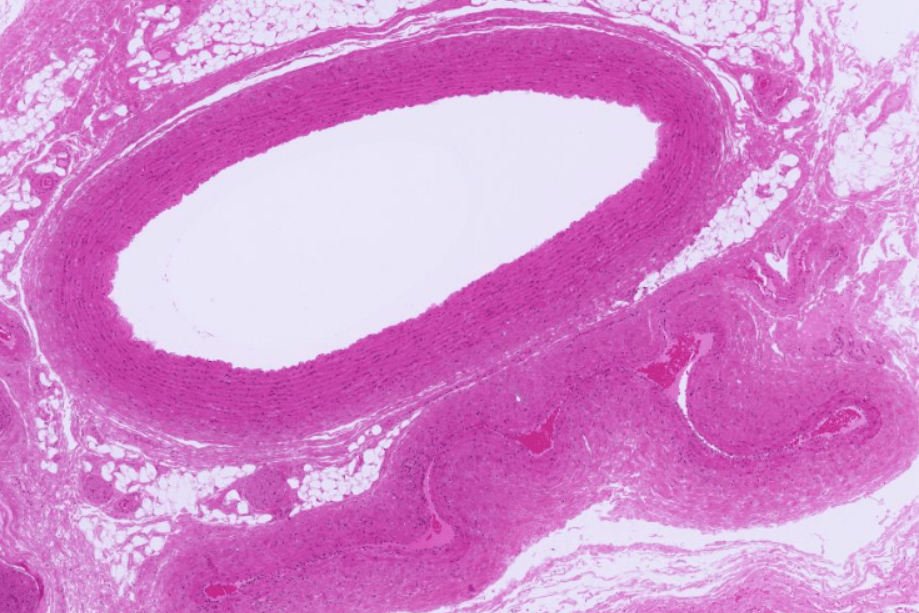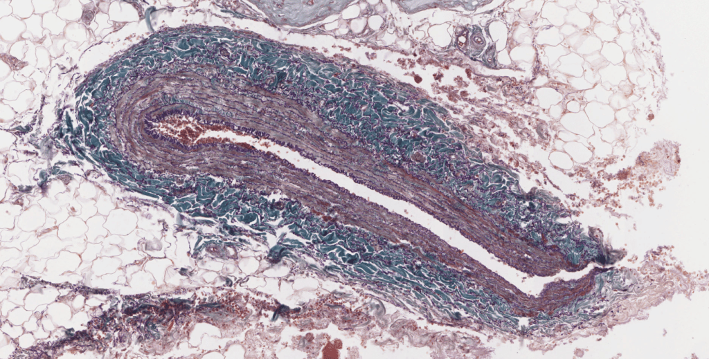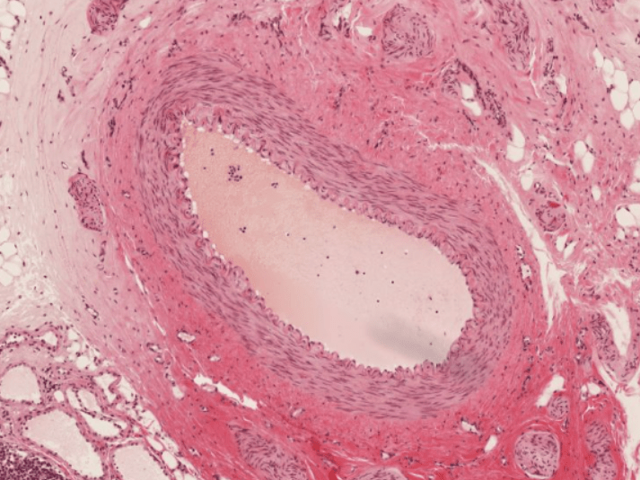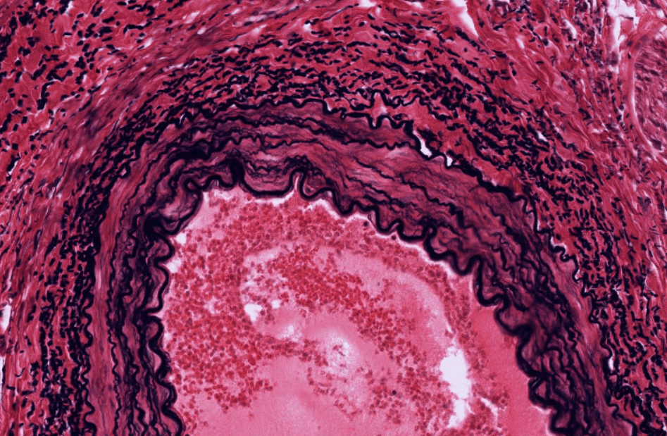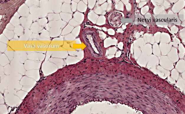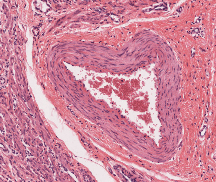 Identifique la lámina elástica interna bien desarrollada en la túnica íntima.Las arterias musculares se caracterizan por tener una lámina elástica interna y externa bien desarrollada en la túnica íntima.La túnica media de estas arterias se caracteriza por poseer abundantes leiomiocitos dispuestos en forma helicoidal.La túnica media de estas arterias les permite distribuir la sangre a los tejidos corporales.Identifique los elementos señalados:Identifique los elementos señalados:Identifique los elementos señalados:Arterias musculares grandes y pequeñas ubicadas en miometrio.Con la técnica de Verhoeff podemos identificar la lámina única fenestrada que conforma la Lámina Elástica Interna.La Vasa Vasorum se ubica en la túnica adventicia de arterias y venas y se encarga de darla nutrientes a las células ubicadas en la túnica media.Observe la escasa distribución de fibras elásticas en la túnica media de la arteria muscular.Las arterias musculares poseen células musculares lisas dispuestas de forma helicoidal en la túnica media y dispuestas longitudinalmente en la túnica adventicia..Las técnicas como Verhoeff nospermiten identificar fácilmente las fibras elásticas en las arterias.Arteria muscular (derecha) y vena (derecha).