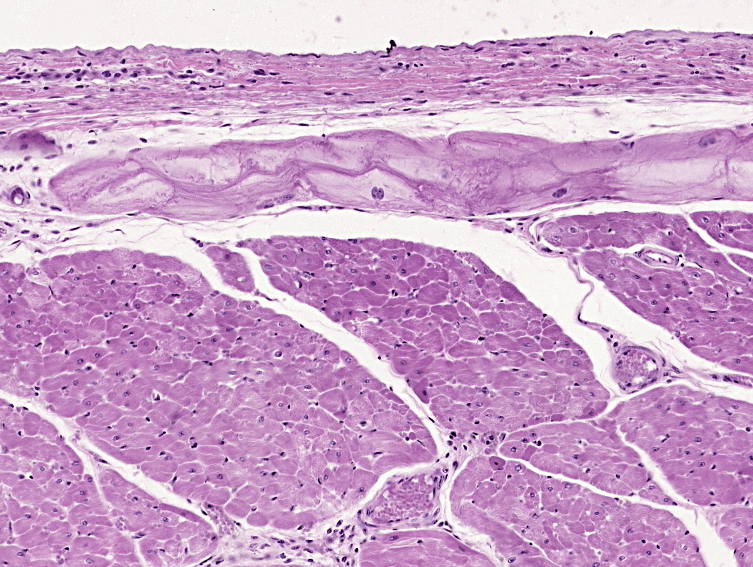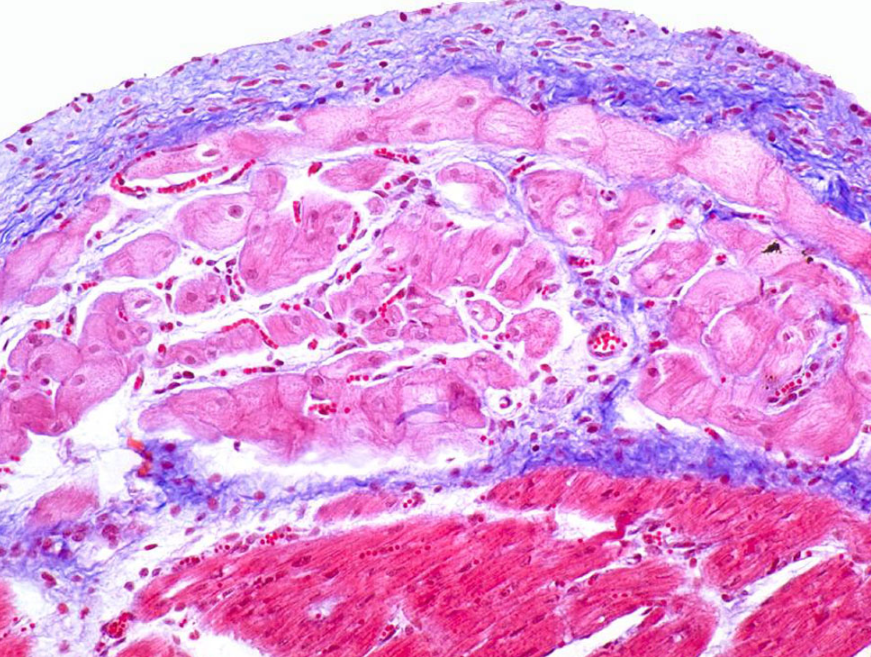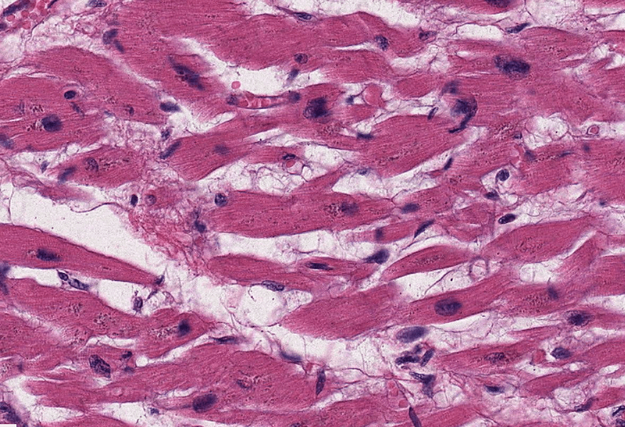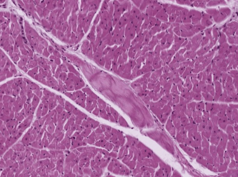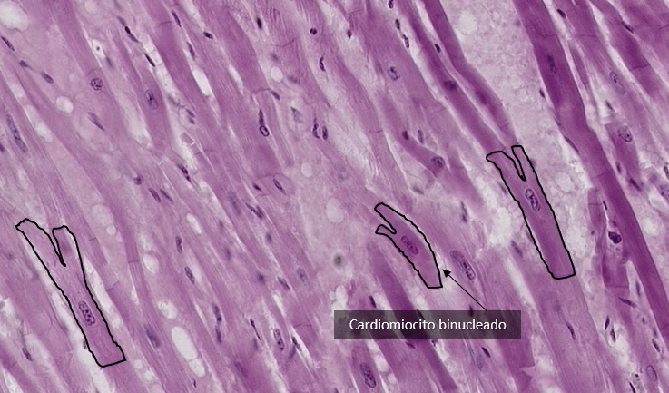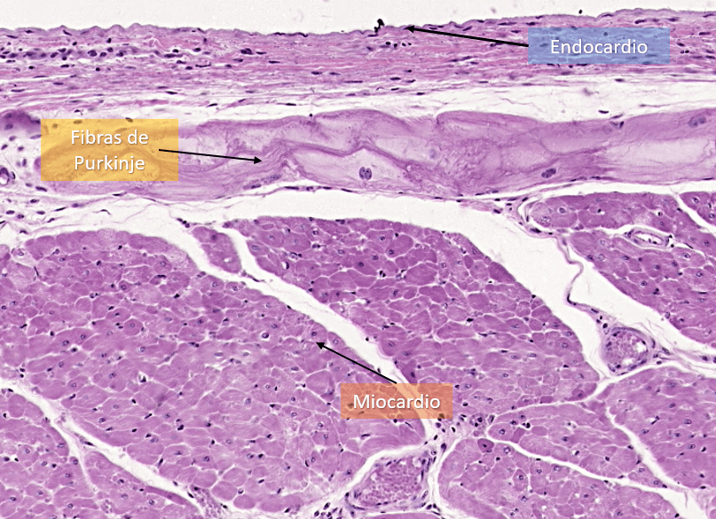 Observe la disposición central de los núcleos en los cardiomiocitos. Este es un corte transversal.Las regiones de union en los cardiomiocitos se conocen como discos intercalares.Identifique la forma «apantalonada» o «bifurcada» de las células cardiacas.Fascia adherens, mácula adherens y nexo son las tres tipos de uniones que conforman los discos intercalares.Observe las inclusiones perinucleares de lipofuscina.El músculo cardiaco se irriga de abundantes capilares continuos.Fibras musculares cardiacas longitudinales teñidas con tricrómico de Gomori.Se observan las Fibras de Purkinje en el subendocardio.Las células del sistema cardionector se observan pálidas» por la escasez de miofilamentos en su citoplasma.Identifique el endotelio del endocardio en la parte superior. Tricrómico de Gomori.Identifique las células cardiacas modificadas que forman las fibras de Purkinje.Observe la válvula semilunar formada por Tejido Conjuntivo DensoLas fibras de Purkinje se encuentran e la capa subendrocárdica.