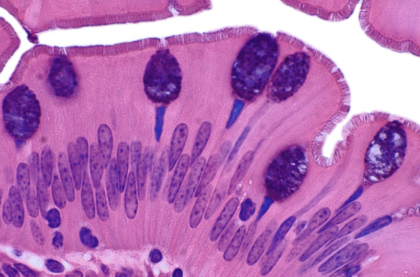 A. Microvellosidades B. Vaso linfático C. Cél. caliciforme D. Linfocitos E. Lámina Propia Junto con el esófago, el duodeno es la única región del tubo digestivo que tiene glándulas en la submucosa.Duodeno. Con la técnica de PAS podemos visualizar las secreciones de las células caliciformes y de las glándulas submucosas. Imagen de la Universidad de YaleObserve las vellosidades intestinales que se forman por las prolongaciones de la mucosa intestinal.Las células de Paneth se observan en el fondo de las criptas intestinales.Las placas de Peyer se ubican en el íleon y pueden encontrarse como nódulos linfáticos que ocupan la mucosa y submucosa.Las flechas señalasn las Placas d Peyer en el íleon.Duodeno de mono, HyE.La mucosa intestinal es un epitelio cilíndrico simple con microvellosidades y células caliciformes.la mucosa del intestino sufre modificaciones, una de ellas es la presencia de vellosidades que se definen como prolongaciones de la mucosa.En los cortes transversales de las vellosidades intestinales podemos identificar el epitelio de revestimiento.El intestino se reviste de un epitelio cilíndrico simple con microvellosidades y células caliciformes.Las células de Paneth se ubican en las tres porciones del intestino delgado.Las células de Paneth se encargan de la producción de lisozimas y catelicidinas.En el íleon es posible identificar cúmulos de linfocitos B organizados en nódulos, se denominan Placas de Peyer.El Plexo de Auerbach (mientérico) regula los movimientos peristálticos del intestino.Las microvellosidades ubicadas en la porción más apical también se conocen como «borde estriado»Identifique las capas del intestino delgado.Epitelio cilíndrico simple con células caliciformes, intestino delgado HyE.La mucosa del intestino sufre tres modificaciones: pliegues circulares, aparición de vellosidades y microvellosidades.Identifique las células de Paneth en el fondo de la cripta intestinal. Imagen de la Universidad de Yale.Intestino delgado teñido con Azul de Alcian + PASIntestino delgado teñido conPentacrómico de Movat., identifique sus capas.Criptas de Lieberkühn, HyeJusto en el centro de la imagen se observa una neurona que forma parte del Plexo mientérico, Yeyuno.Técnica de PAS utilizada para destacara el moco producido por las células caliciformes.Las Placas de Peyer se señalan con las felchas amarillas. íleon, Hye.