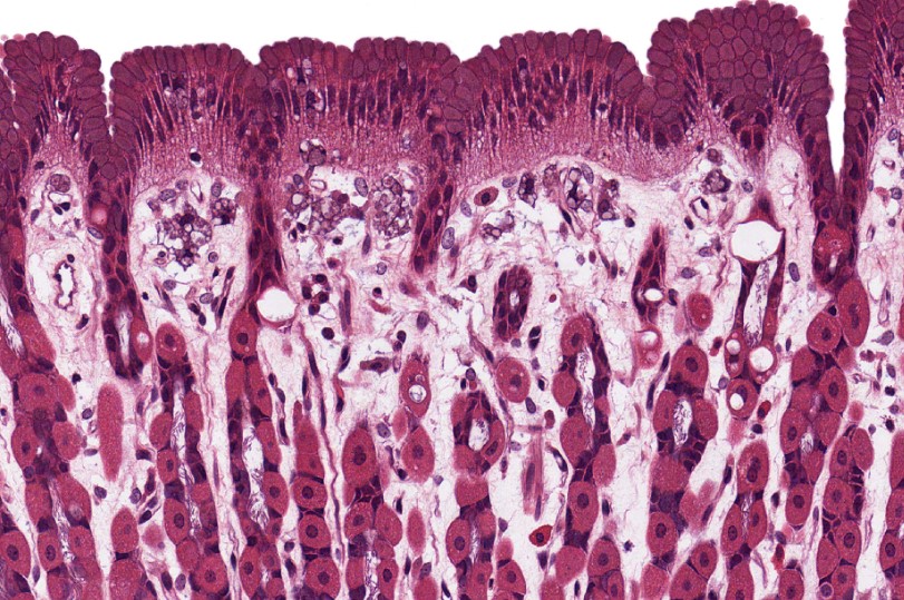 El estómago es la región dilatada dl tubo digestivo y se compone de mucosa, submucosa, muscular externa y serosa.Estómago. Tinción: PAS – Azure IILas células principales se ubican en la parte más profunda de la glándula gástrica y las parietales en el cuello de la glándula. Las células mucosas superficiales secretan moco visible para proteger al epitelio del ácido gástrico.La mucosa gástrica carece de células caliciformes, pues su epitelio es mucoproductor.Identifique el epitelio cilíndrico simple mucoproductores que reviste la mucosa gástrica.Identifique la parte profunda de la glándula (arriba) y la parte más superficial (abajo)Las células parietales se encargan de la producción de Ác. clorhídrico y Factor intrínseco.Las células parietales suelen tener la vida media más larga. (200 días)Corte histológico de estómago donde se observan sus capas.Las células principales se encargan de la producción de pepsinógeno.Transición esófago-gástrica.Estómago, HyE.