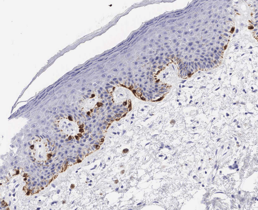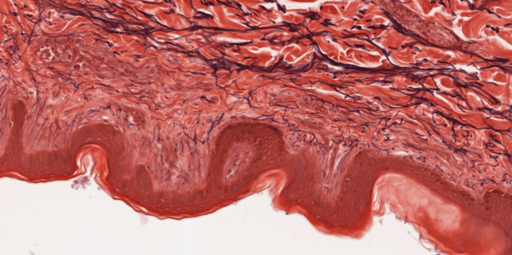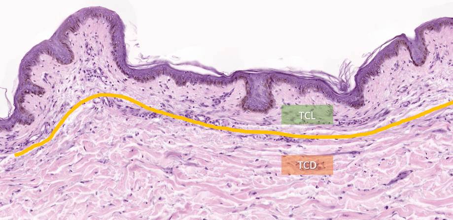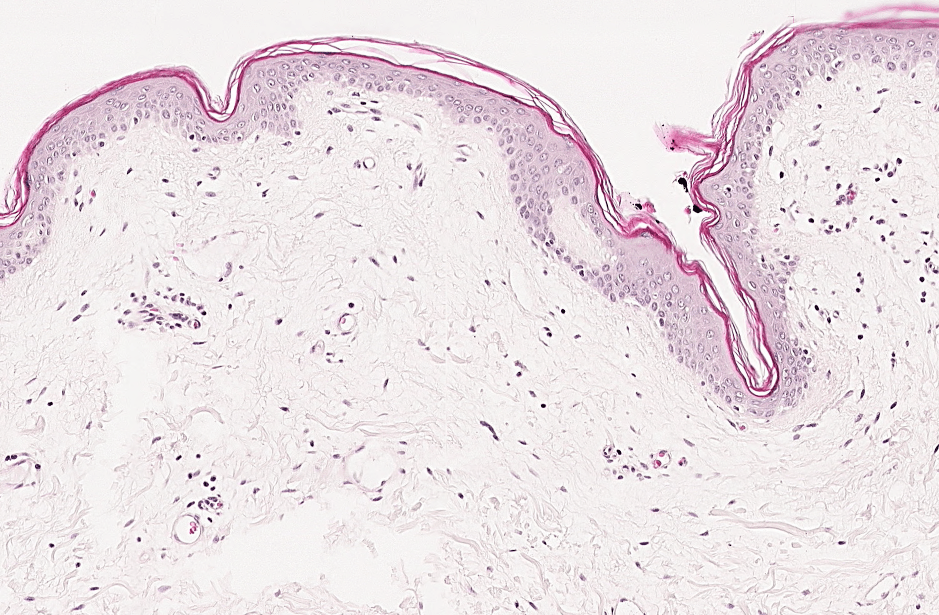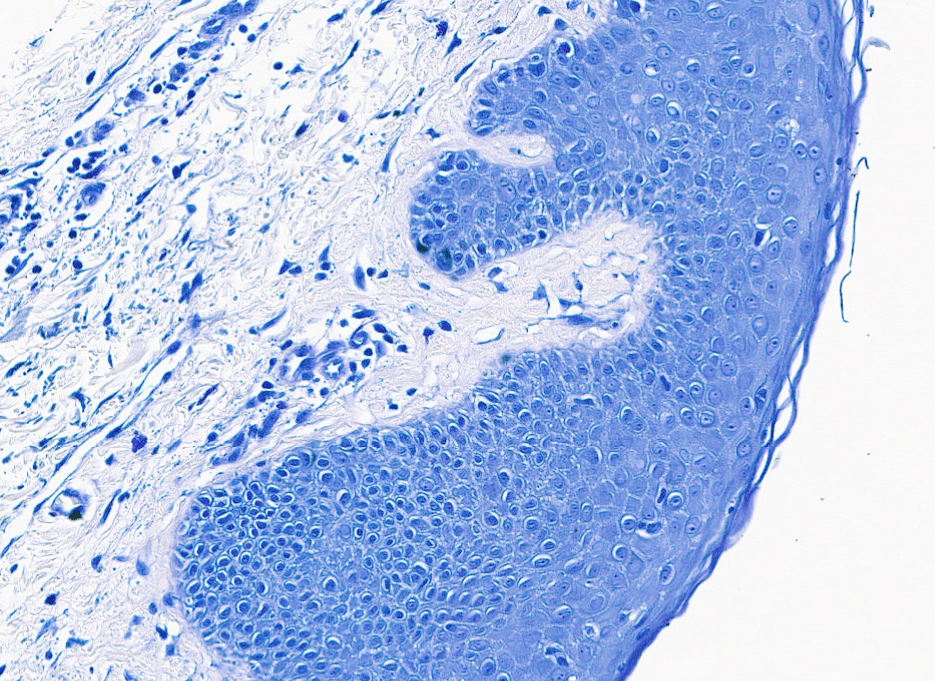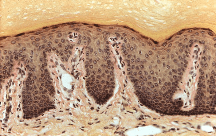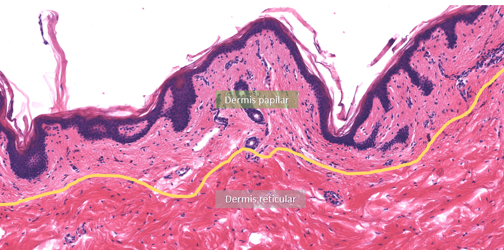 Inmunohistoquímica anti-TYR (tirosinasa) que nos permite visualizar melanocitos.El pabellón auricular está recubierto de piel delgada con abundantes folículos pilosos.Observe los delgados filamentos de queratina que recubren el epitelio de la piel delgada.La piel delgada está recubierta por un epitelio plano estratificado con estrato córneo (poco desarrollado)Piel delgada teñida con hematoxilina-eosina, azul de metileno.Podemos encontrar algunas fibras elásticas distribuidas a lo largo de la piel, estas podemos identificarlas con la técnica de Verhoeff teñidas de color negro.Observe el epitelio plano estratificado sin estrato córneo.Diferencias entre dermis reticular y dermis papilar.Piel delgada, HyE.Piel delgada, HyE.Piel delgada, HyE.Piel delgada teñida con hematoxilina-eosina, azul de metileno.La dermis papilar está justo debajo de la epidermis.La peptidasa 5 relacionada con la calicreína, anteriormente conocida como enzima tríptica del estrato córneo, es una serina proteasa expresada en la epidermis.Piel delgada, HyE.La dermis papilar se conforma de TCL (tejido conjuntivo laxo) y la dermis reticular de TCD (tejido conjuntivo denso)Labio, HyE.