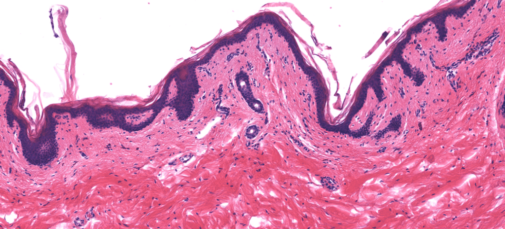Piel humana teñida con Van Gieson. Procesamiento; Laboratorio de Histología del DBCT, FACMED UNAM.Identifique los 5 estratos de la piel gruesa.Observe el estrato córneo en la parte superior de esta fotomicrografía.Los nodos de Bizzozero son las uniones desmosomales que existen entre los espinociots.Identifique el estrato córneo en esta fotomicrografía.Piel gruesa de ratón, HyE.Técnica de ATPasa uqe nos permite visualizar las Células de Langerhans. Procesamiento; Laboratorio de Histología del DBCT, FACMED UNAM.Los espinocitos y sus «espinas» son visibles a grandes aumentos con el microscopio óptico.Folículo piloso teñido con Tricrómico de Mallory. Procesamiento; Laboratorio de Histología del DBCT, FACMED UNAM.La Técnica Fontana Masso nos permite visualizar la melanina producida por los melanocitos a lo largo de la epidermis. Procesamiento; Laboratorio de Histología del DBCT, FACMED UNAM.Observe la melanina incluida en los melanocitos.1. Epidermis 2. Dermis 3. Hipodermis