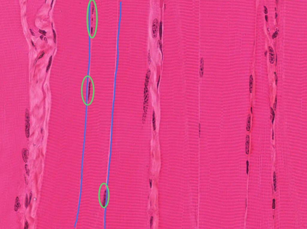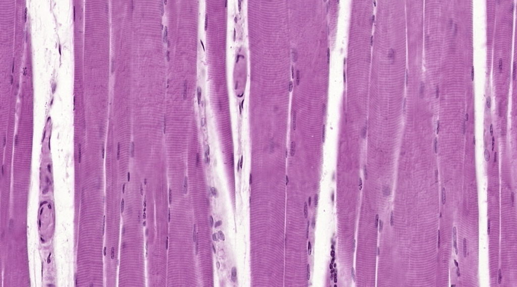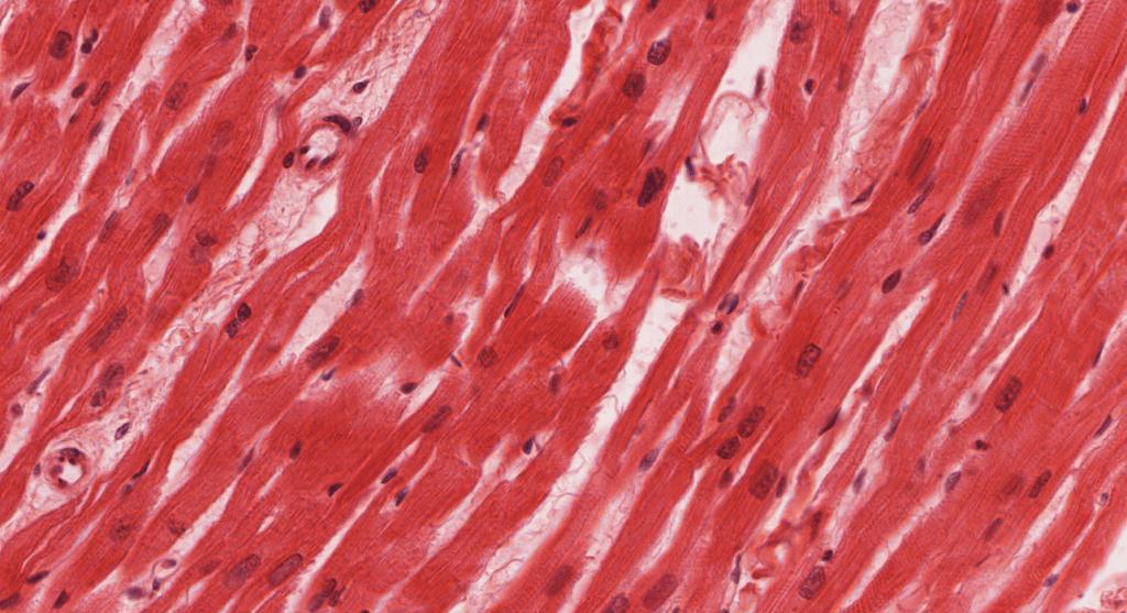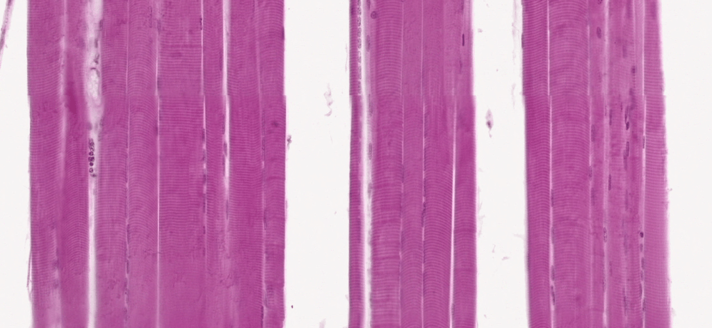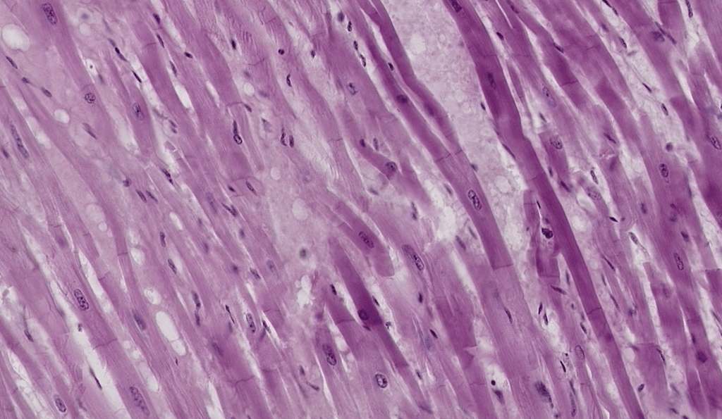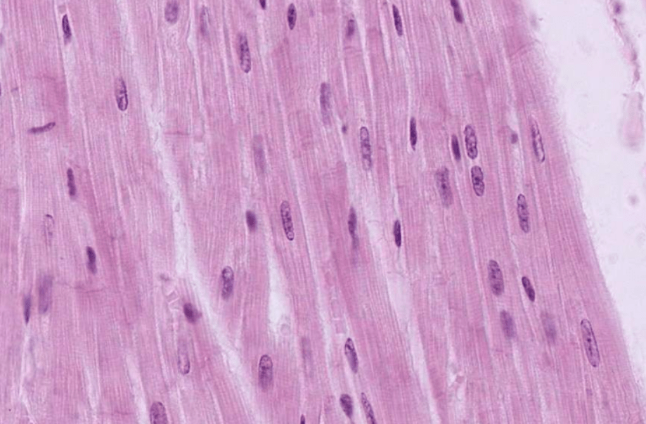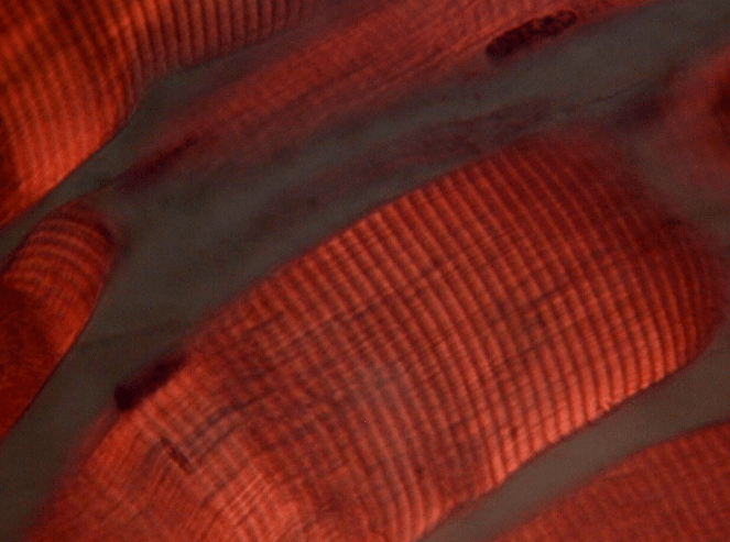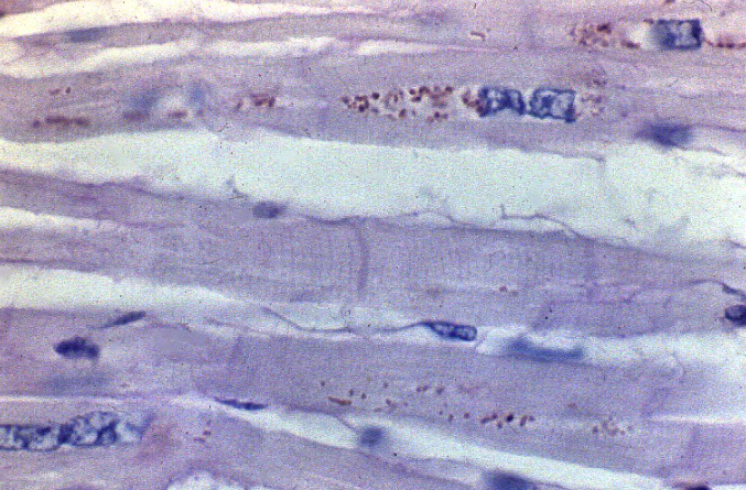 Sus células presentan morfología “apantalonada”, con unnúcleo central,estriaciones transversales, bandas cruzadas teñidas intensamente (discos intercalares), así mismo se pueden encontrar material granular perinuclear (Lipofuscina).