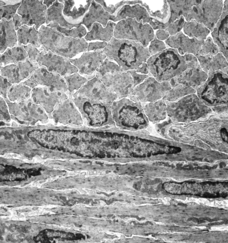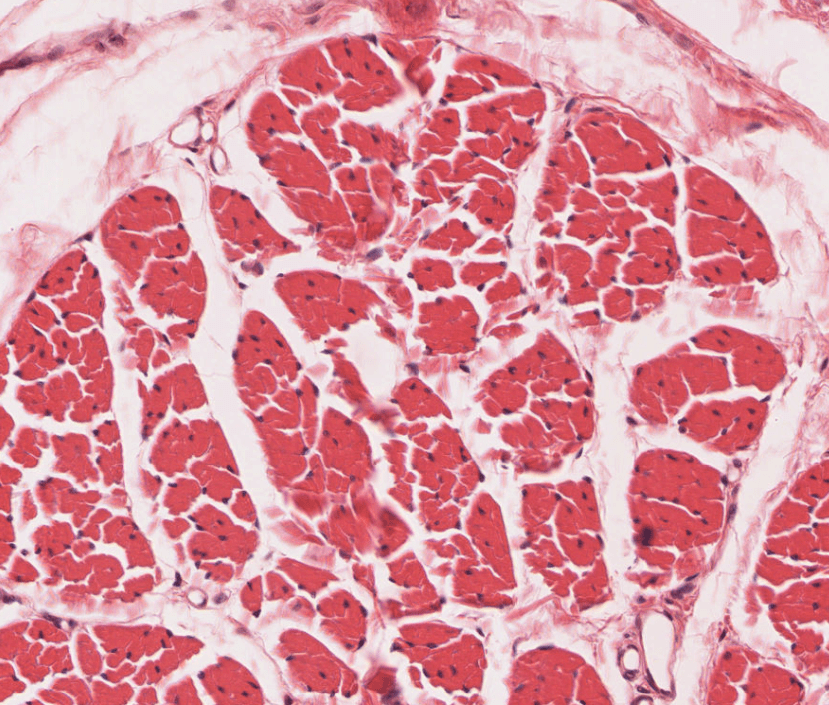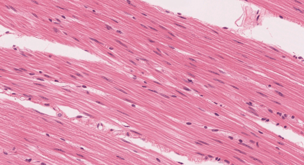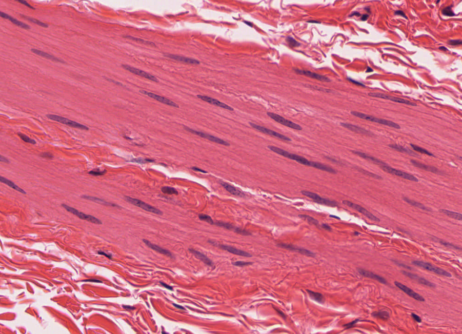 El músculo liso carece de estriaciones, sus núcleos son únicos y centrales.Con tricrómico de Masson las fibras musculares lisas se tiñen de color rojo.Corte longitudinal de músculo liso, HyE.El miometrio es un sitio donde abunda el músculo liso, estas células son estimuladas por oxitocina..Corte transversal de músculo liso, HyE.Células musculares lisas teñidas con HyE.Los leiomiocitos tienen un núcleo único, central y en forma de huso.La forma alargada de los núcleos es clave para identificar el músculo liso.Identifique la morfología de los núcleos de las cél. musculares lisas al MET. Tienen forma alargada (de huso).Leiomiocito relajado vs contraído observado al MEB.La disposición de las células musculares no siempre es homogénea.
