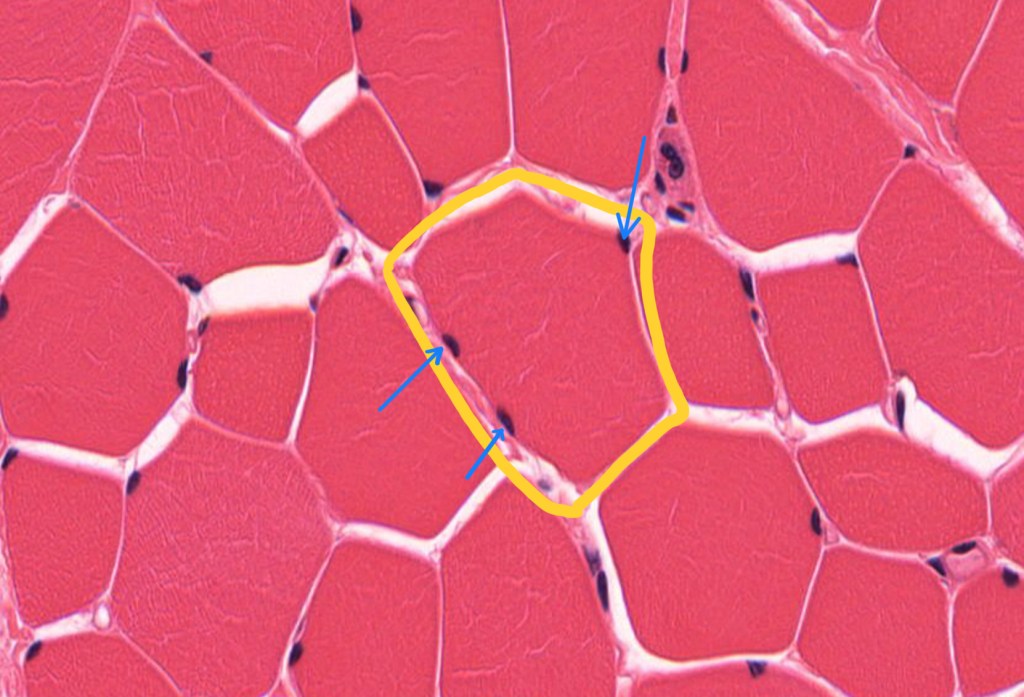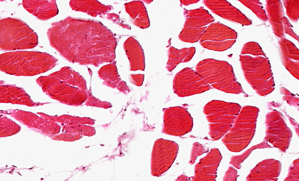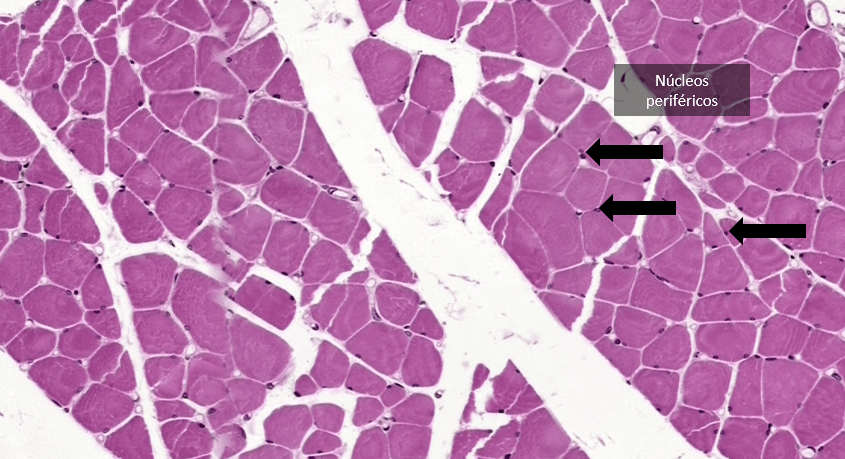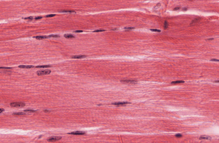 Células largas, cilíndricas, con numerosos núcleos periféricos y presenta estriaciones transversales.