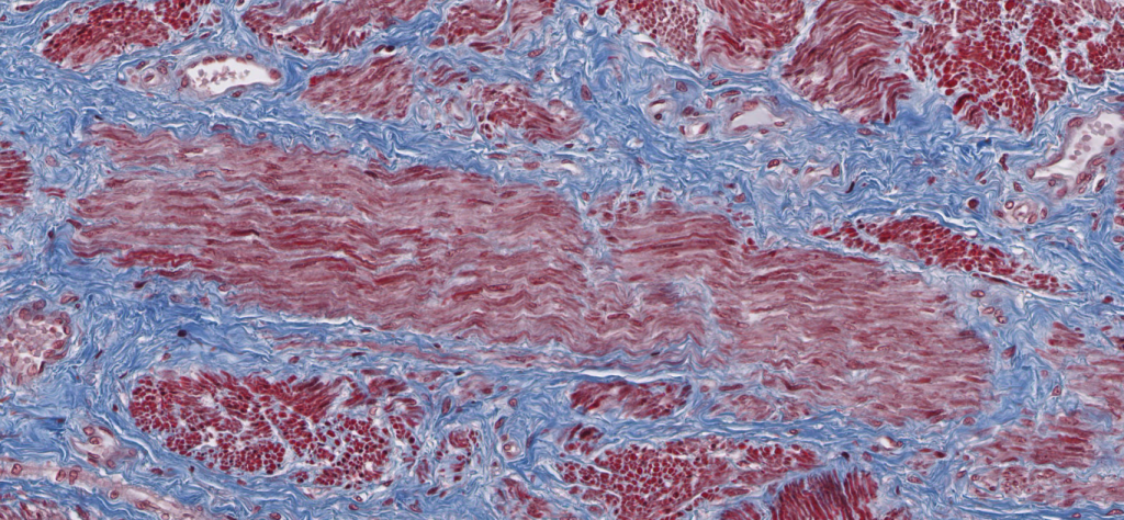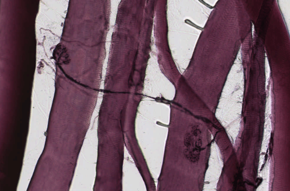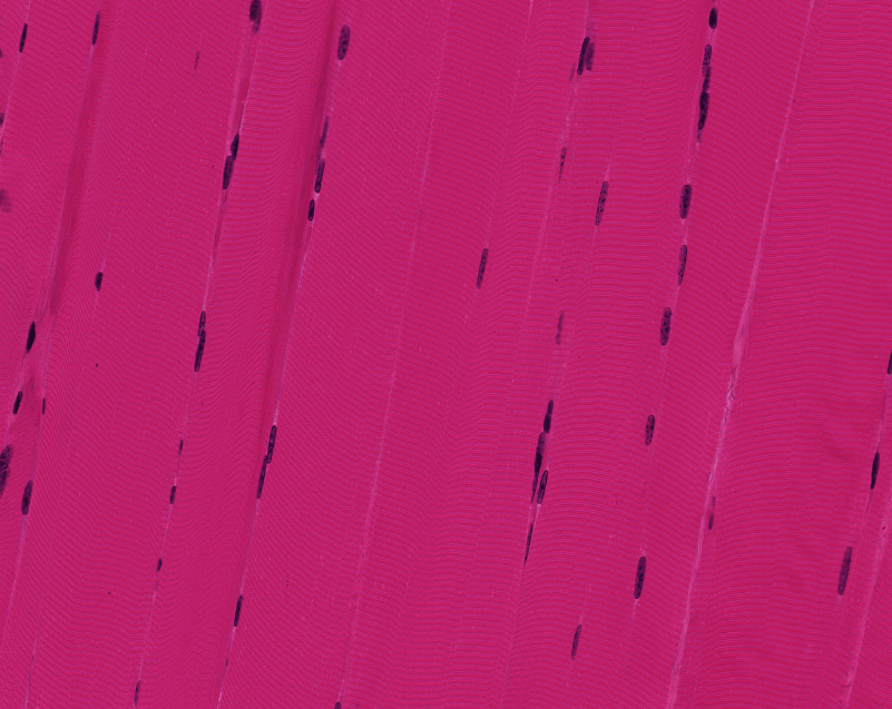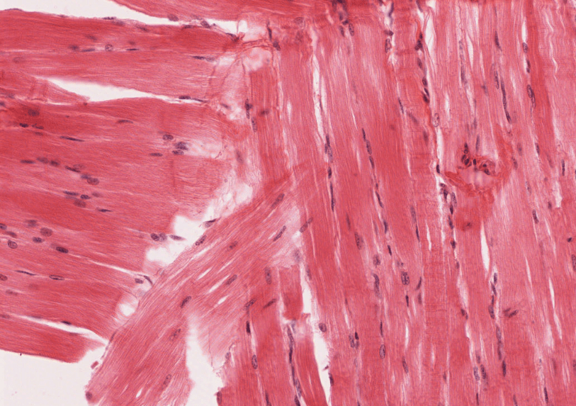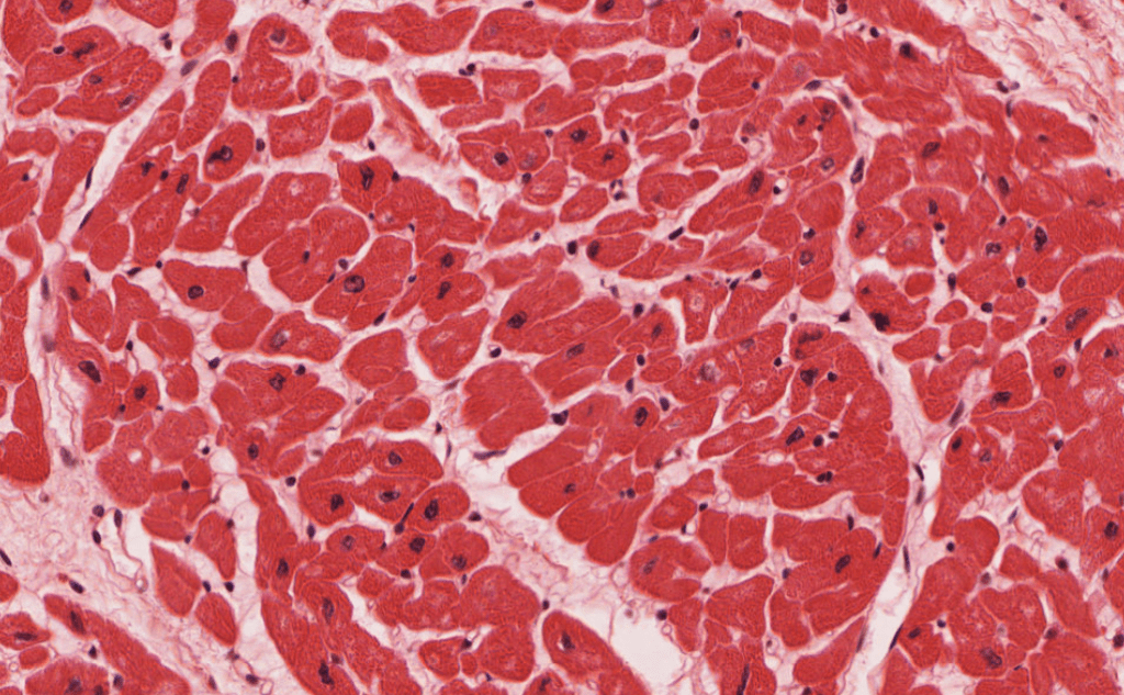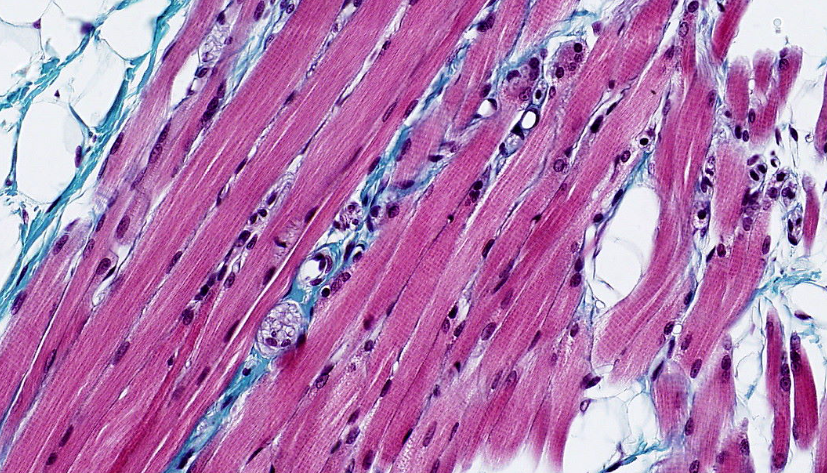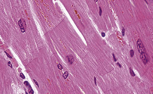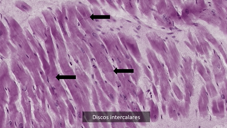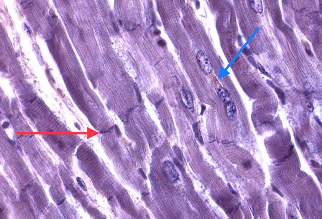 Fibras musculares cardiacas longitudinales teñidas con HyE.Identifique la forma «apantalonada» o «bifurcada» de las células cardiacas.Las uniones entre cardiomiocitos son denomiadas «discos intercalares»Observe la disposición central de los núcleos en los cardiomiocitos. Algunos de ellos son binucleados. Este es un corte longitudinalObserve la disposición central de los núcleos en los cardiomiocitos. Este es un corte transversalEl músculo cardiaco se irriga de abundantes capilares continuos.Las regiones de unión en los cardiomiocitos se conocen como discos intercalares.Observe las inclusiones perinucleares de lipofuscina.Fascia adherens, mácula adherens y nexo son las tres tipos de uniones que conforman los discos intercalares..Disco intercalar (rojo), inclusión de lipofuscina (azul)Identifique las inclusiones de lipofuscina y los capilares en el músculo.Identifique los gránulos de lipofuscina en los cardiomiocitos adultos. Procesamiento; Laboratorio de Histología del DBCT, FACMED UNAM.