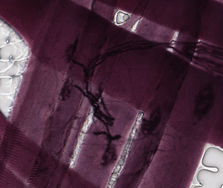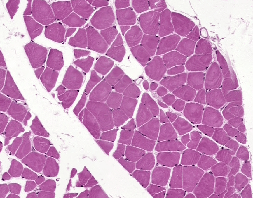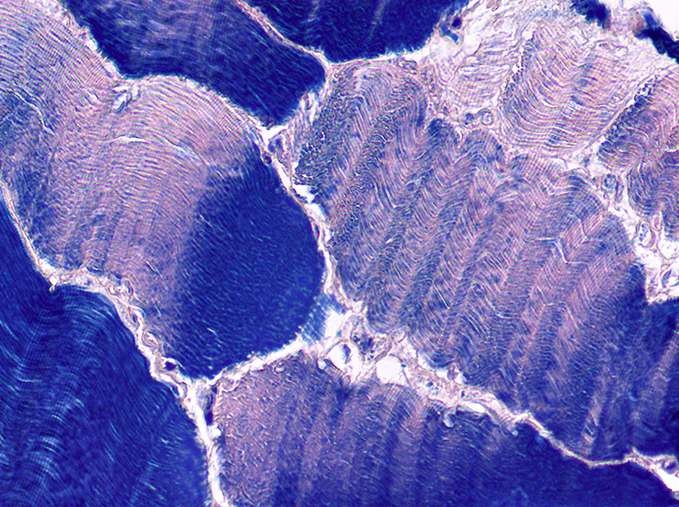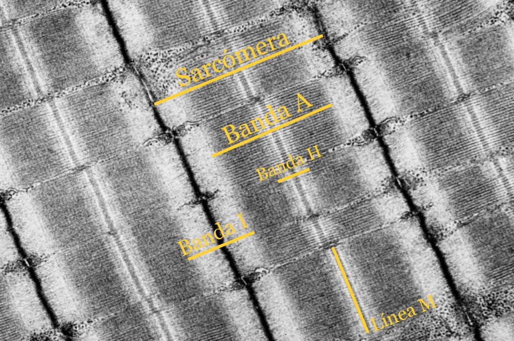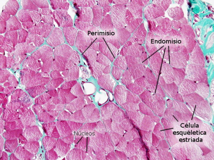 Sección longitudinal de músculo estriado esquelético, se delimita con azul una fibra muscular larga, cilíndrica con estriaciones y de color verde se evidencian sus múltiples núcleos periféricos. Fotomicrografía de sección transversal de músculo estriado esquelético, donde observamos de color amarillo una fibra muscular y sus múltiples núcleos periféricos (flechas azules). Observe la disposición periférica y morfología alargada de los núcleos en esta fotomicrografía de sección longitudinal. El músculo se tiñe de rosa a rojo con H&E debido a su abundante vascularizaciónSección transversal del músculo esquelético con núcleos periféricosFotomicrografía de sección transversal, donde se pueden observar capilares continuos.El músculo en su totalidad es rodeado por TCDI (Epimisio-amarillo), rodeando fascículos de fibras musculares encontramos al perimisio (azul) y al último, fibras reticulares y una lámina basal rodean a cada célula muscular (verde). Identifique el perimisio, y epimisio en el músculo.Rodeando fascículos de fibras musculares encontramos al perimisio.Tejido muscular que, de izquierda a derecha se muestra; corte transversal, longitudinal y a la derecha transversal. Dentro de cada célula muscular, en su citoplasma (Sarcoplasma), podemos encontrar grupos longitudinales de miofibrillasLas miofibrillas están alineadas entre sí y son responsables de las estriaciones transversales en bandas claras y oscuras.En microscopía electrónica y fotónica de campo claro, las Bandas A (Anisótropas) se observarán oscuras (“dArk”) y las Bandas I (Isótropas) se observan claras (“LIght”). En microscopio de luz polarizada, las bandas A se mostrarán brillantes y oscuras las bandas I En esta fotomicrografía de campo claro con sección longitudinal de músculo estriado, se observan bandas claras (Banda I) y bandas oscuras (Banda A)El sarcómero es la unidad funcional de la miofibrilla y está delimitado por dos discos Z (líneas oscuras), el centro de cada banda A está ocupado por una zona pálida, Banda H, que está dividida por la línea M. Las bandas I son divididas por los discos Z. Durante la contracción, la banda I se estrecha, la linea M y banda H desaparecen, los discos Z se aproximan entre sí y la banda A no sufre cambios. Corte longitudinal de tejido muscular donde se observan estriaciones y múltiples núcleos periféricos alargados.Las fibras musculares esqueléticas no siempre se distribuyen hacia una misma dirección.Observe las fibras musculares transversalmente, y sus núcleos periféricos.Músculo estriado esquelético, HyE.Placa motora evidenciada con técnicas argénticas.Las terminaciones nerviosas de las neuronas motoras se relacionan con las fibras musculares esqueléticas.Placa motora.Unión musculo-tendinosa. Tricrómico de Masson,Músculo esquelético teñido con Tricrómico de Masson.Identifique los núcleos periféricos de las fibras musculares esqueléticas.Con luz polarizada es posible observar claramente las estriaciones. Procesamiento; Laboratorio de Histología del DBCT, FACMED UNAM.Músculo esquelético teñido con hematoxilina fosfotúngstica.