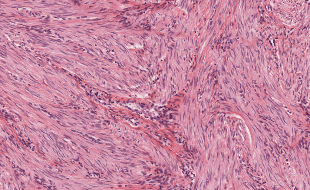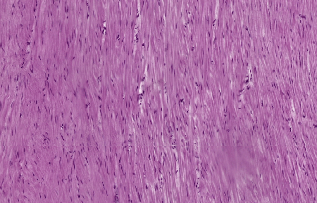Tejido dispuesto en haces o láminas de células fusiformes o ahusadas y alargadas con un único núcleo central. NO presenta estriaciones, ni forma sarcómeros.