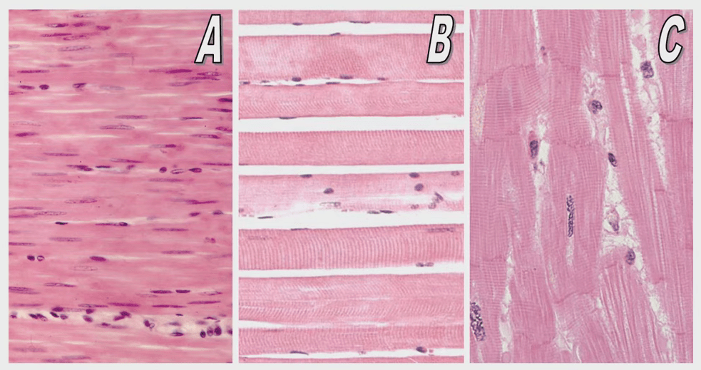 Observe las diferencias de los tres tipos de músculos. A. Liso B. Esquelético C. Cardiaco