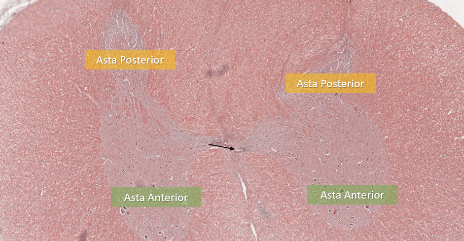 Identifique las características de la médula espinal a pocos aumentos.Observe el conducto ependimario revestido de ependimocitos.El conducto ependimario se ubica en la región central de la médula espinal, y es la región por donde pasa el líquido cefalorraquídeo.Observe la morfología de los somas neuronales ubicado en el Asta Posterior, son circulares.Observe la morfología de los somas neuronales ubicado en el Asta Anterior, son piramidales/triangulares.La neuronas motoras se ubican sobre todo en el Asta Anterior.Identifique la sustancia blanca y la sustancia gris.En el asta anterior de la médula espinal los somas son piramidales o triangulares, en el asta posterior exhiben morfología circular.Neurona sensitiva ubicada en el Asta Posterior de la Médula Espinal. Procesamiento; Laboratorio de Histología del DBCT, FACMED UNAM.Neuronas del Asta Posterior. Procesamiento; Laboratorio de Histología del DBCT, FACMED UNAM.