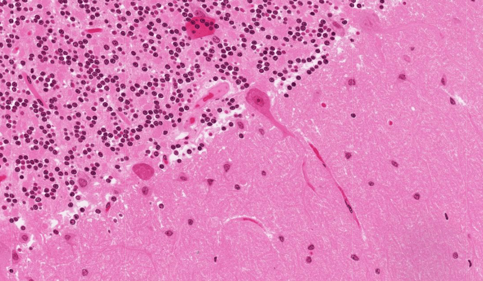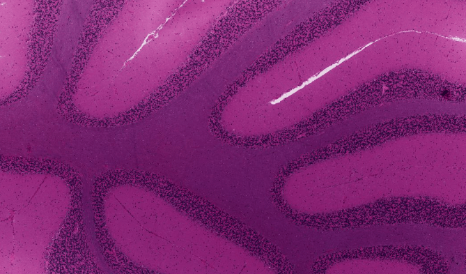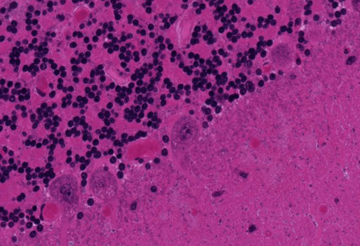 La célula de Purkinje tiene un solo axón que no suele ser evidente en los cortes teñidos con HyELas células de Purkinje se destacan como el tipo neuronal más distintivo y visible del cerebelo.Observe la distribución de las capas en la corteza cerebelosa.Corteza cerebelosa, HyE.Las células de Purkinje son características del cerebelo y cada una posee abundantes dendritas que se arborizan en la capa molecularCorteza cerebelosa, HyE.Observe la morfología característica de las células ubicadas en la capa media de la corteza cerebelosa.Las células granulosas reciben los impulsos que provienen de otras partes del sistema nervioso central y envían axones hacia la capa molecular.La corteza se cerebelosa consta de 3 capas bien delimitadas (de abajo hacia arriba): la molecular, la media y la granulosaLa técnica de Bielschowsky nos permite evidenciar las células de Purkinje ubicadas en la capa media de la corteza cerebelosa.En el límite entre las capas molecular y granulosa se encuentran los grandes son más de las células de Purkinje que tienen forma de matraz o pera.Las células en cesta son las neuronas que se observan con mayor frecuencia en la capa molecular.