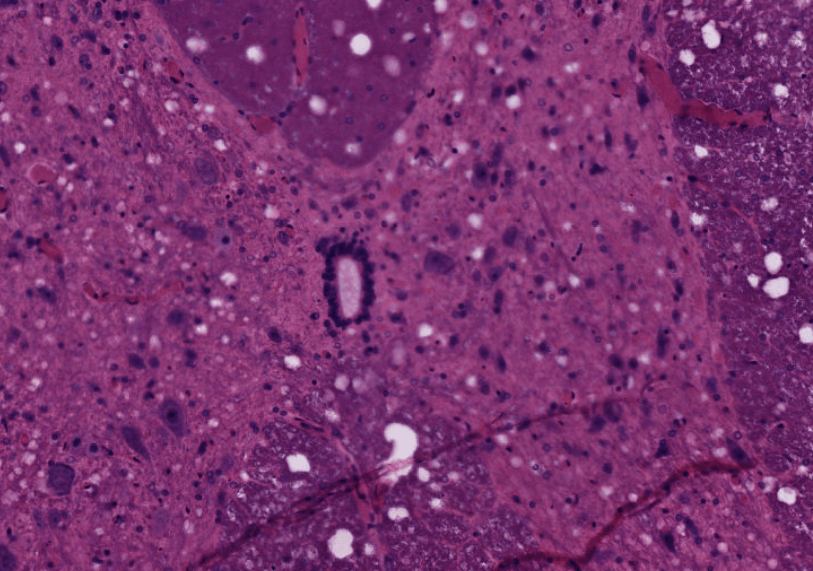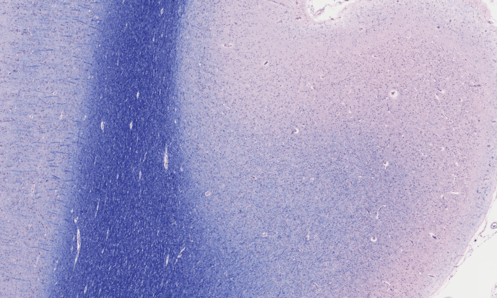 Corteza cerebral, HyE.Las capas no tienen límites bien definidos, por lo que no es posible observarlas con claridad.Observe la sustancia gris (parte clara), y la sustancia blanca (parte oscura/azul).Las neuronas forman redes de comunicación y trasmiten información a través de sinapsisIdentifique los somas neuronales en la corteza cerebral.Corteza cerebral, HyE.Corteza cerebral. Procesamiento; QFB. Concepción Rugerio Vargas. Laboratorio de Técnicas Especiales, DBCT, FACMED UNAM.