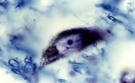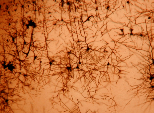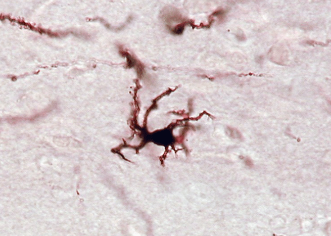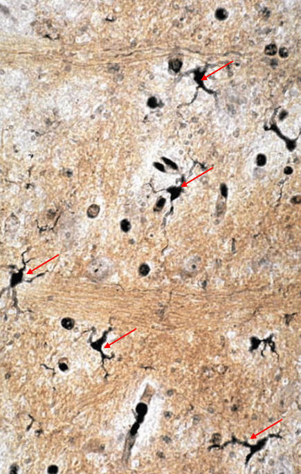 Las células de la microglía se originan en la médula ósea y son células presentadoras de antígeno (APC).Célula de la microglia aislada. Procesamiento; QFB. Concepción Rugerio Vargas. Laboratorio de Técnicas Especiales, DBCT, FACMED UNAM.Las fechas rojas señalan células de la microglía.