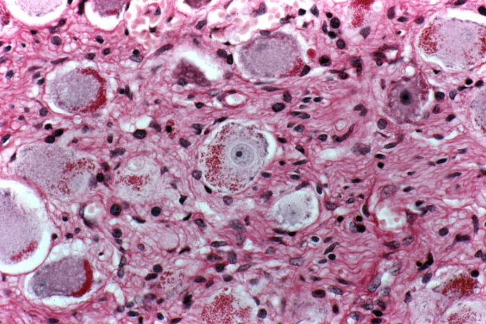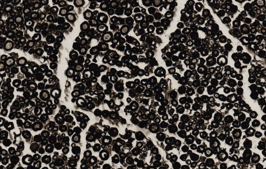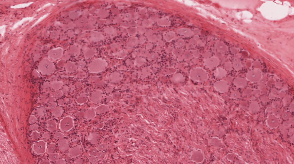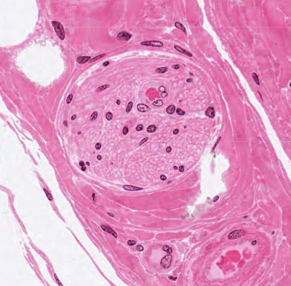 Observe los núcleos dentro del nervio periférico, corresponden a células de Shcwann.Los «halos» negros alrededor de las fibras nerviosas es la mielina formada por las c. de Schwann.Identifique el epineuro del nervio periférico en la parte superior izq.Corte transversal de un nervio periférico , HyE.Recuerda que el endoneuro NO es visible con microscopia óptica con las técnicas de rutina.