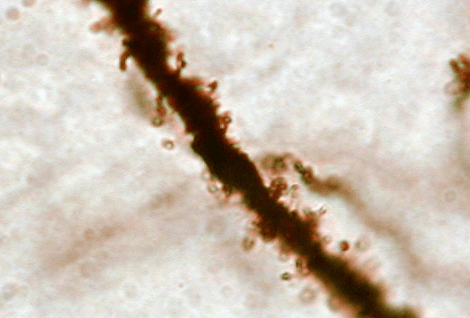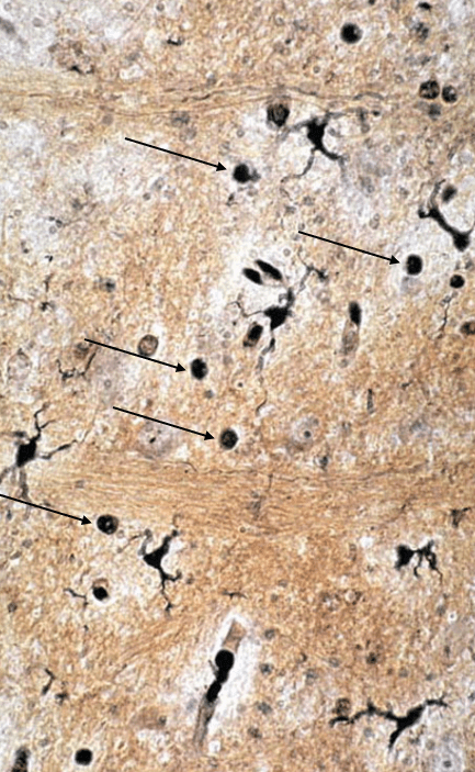 Los oligodendrocitos se encargan de mielinizar el sistema nervioso central.Oligodendrocitos. Procesamiento; QFB. Concepción Rugerio Vargas. Laboratorio de Técnicas Especiales, DBCT, FACMED UNAM.Procesamiento; QFB. Concepción Rugerio Vargas. Laboratorio de Técnicas Especiales, DBCT, FACMED UNAM.Estas células suelen alinearse en hileras entre los axones. Procesamiento; QFB. Concepción Rugerio Vargas. Laboratorio de Técnicas Especiales, DBCT, FACMED UNAM.Los oligodendrocitos son redondos y emiten ligeras prolongaciones hacia los axones para mielinizarlos.