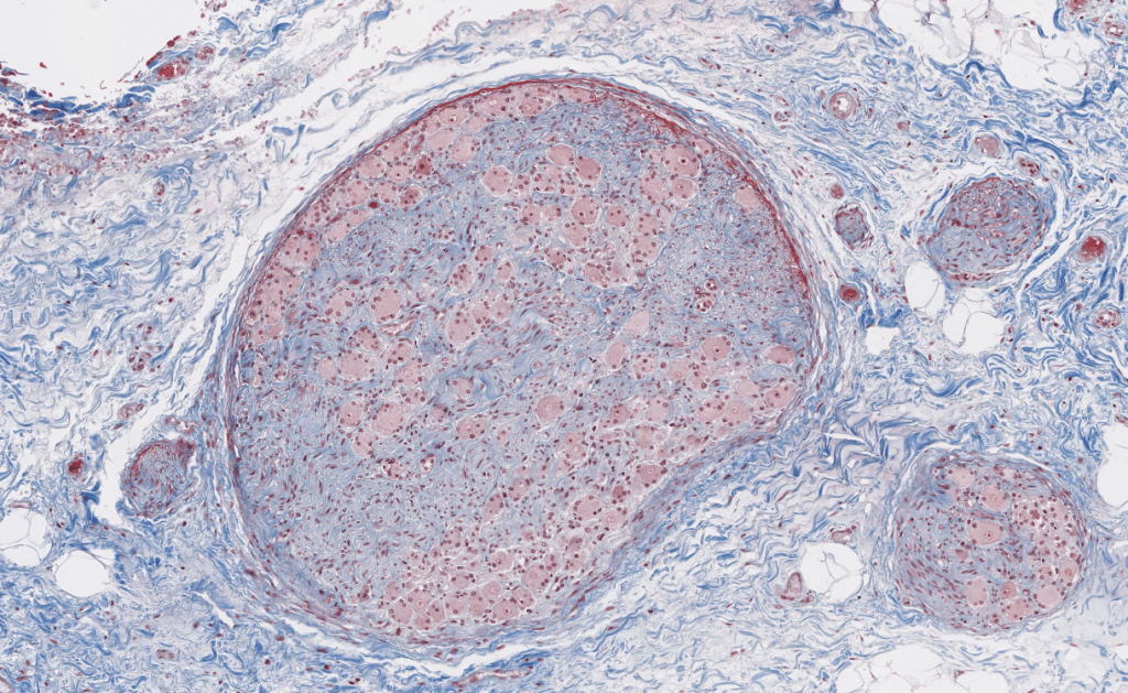 Neurona ganglionar simpática rodeada de algunas células satélite.Las células satélite rodean las células ganglionares y regulan su microambiente.Estas células tienen como principal función darle sostén a las neuronas ganglionares.El núcleo de las células satélite suele ser redondo y se ubica alrededor de los somas de neuronas ganglionares.Ganglio de la raíz dorsal.Ganglio de la raíz dorsal.Los ganglios de la raíz dorsal son grupo de nódulos situados en las raíces dorsales o posteriores de los nervios espinales y donde se alojan los cuerpos de las neuronas de la vía aferente del sistema nervioso periférico.Ganglio de la raíz dorsal.No olvides que las neuronas ganglionares presentan gránulos de lipofuscina en su citoplasma. Procesamiento; Laboratorio de Histología del DBCT, FACMED UNAM.Ganglio de la raíz dorsal. Tricrómico de Masson.Ganglio de la raíz dorsal. Tricrómico de Masson.