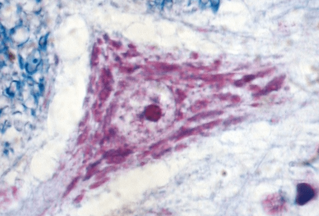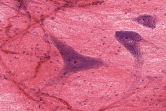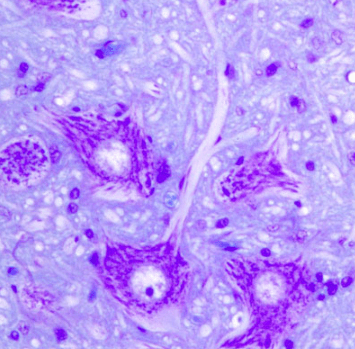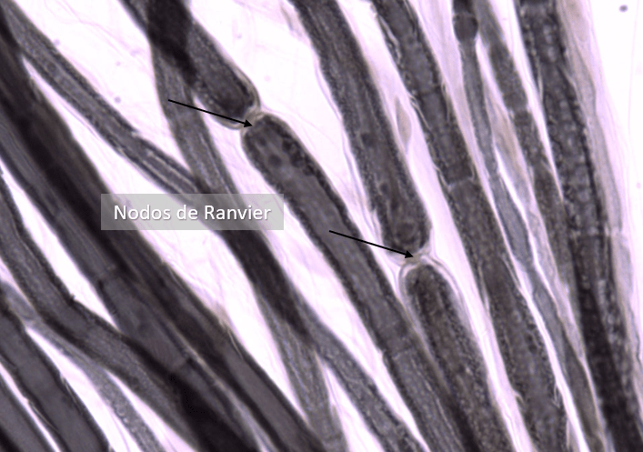 Identifique la sustancia Nissl en el citoplasma neuronal, corresponde al RER.Las neuronas forman redes de comunicación y se relacionan a través de sinapsis.Los axones de las neuronas transportan señales de salida y se originan en el cono axónico.Las dendritas permiten recibir impulsos, son prolongaciones cortas que se originan a partir del soma.La eucromatina de los núcleos neuronales le da el aspecto claro lo que se conoce como «ojo de lechuza». Procesamiento; Laboratorio de Histología del DBCT, FACMED UNAM.Las neuronas son las unidades funcionales del sistema nervioso.Neuronas motoras ubicadas en el asta anterior de la médula espinal.Los nodos de Ranvier permiten el intercambio de iones y moléculas así como la despolarizaciónImagen recuperada de la Universidad de Yale.Observe los gránulos de lipofuscina que pueden exhibir las neuronas.Los núcleos de las neuronas exhiben un nucléolo prominente y tienen abundante eucromatina. Procesamiento; Laboratorio de Histología del DBCT, FACMED UNAM.Neurona con inclusión de neuromelanina ubicada en el Locus Niger. Procesamiento; Laboratorio de Histología del DBCT, FACMED UNAM.Procesamiento; Laboratorio de Histología del DBCT, FACMED UNAM.Las espinas dendríticas son protuberancias de las dendritas y son susceptibles a la edad, estimulación y alimentación. Procesamiento; QFB. Concepción Rugeiro Vargas. Laboratorio de Técnicas Especiales, DBCT, FACMED UNAM.Las dendritas de las neuronas se encargan de recibir señales de entrada y transmitirlas al soma. Procesamiento; QFB. Concepción Rugeiro Vargas. Laboratorio de Técnicas Especiales, DBCT, FACMED UNAM.Procesamiento; QFB. Concepción Rugerio Vargas. Laboratorio de Técnicas Especiales, DBCT, FACMED UNAM.